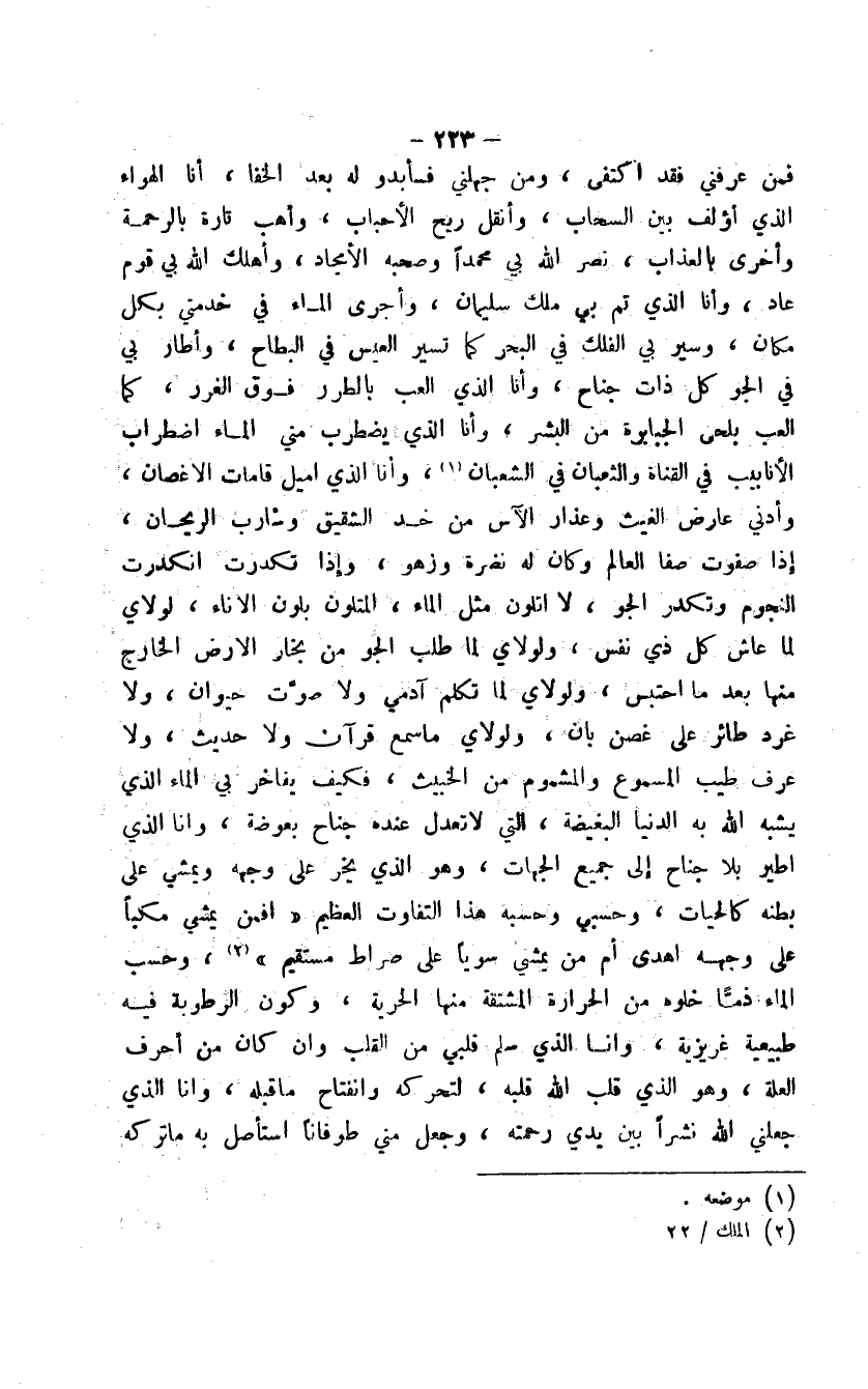 فمن عرفني فقد اكتفى، ومن جهلني فسأبدو له بعد الخفا، أنا الهواء الذي أؤلف بين السحاب، وأنقل ريح الأحباب، وأهب تارة بالرحمة وأخرى بالعذاب، نصر الله بي محمداً وصحبه الأمجاد، وأهلك الله بي قوم عاد، وأنا الذي تم بي ملك سليمان، وأجرى الماء في خدمتي بكل مكان، وسير بي الفلك في البحر كما تسير العيس في البطاح، وأطار بي في الجو كل ذات جناح، وأنا الذي ألعب بالطرر فوق الغرر، كما العب بلحى الجبابرة من البشر، وأنا الذي يضطرب مني الماء اضطراب الأنابيب في القناة والثعبان في الشعبان، وأنا الذي أميل قامات الأغصان، وأدني عارض الغيث وعذار الآس من خد الشقيق وشارب الريحان، إذا صفوت صفا العالم وكان له نضرة وزهو، وإذا تكدرت انكدرت النجوم وتكدر الجو، لا أتلون مثل الماء، المتلون بلون الإناء، لولاي لما عاش كل ذي نفس، ولولاي لما طلب الجو من بخار الأرض الخارج منها ما احتبس، ولولاي لما تكلم آدمي ولا صوت حيوان، ولا غرد طائر على غصن بان، ولولاي ما سمع قرآن ولا حديث، ولا عرف طيب المسموع والمشموم من الخبيث، فكيف يفاخر بي الماء الذي يشبه الله به الدنيا البغيضة، التي لا تعدل عنده جناح بعوضة، وأنا الذي أطير بلا جناح إلى جميع الجهات، وهو الذي يخر على وجهه ويمشي على بطنه كالحيات، وحسبي وحسبه هذا التفاوت العظيم " أفمن يمشي مكباً على وجهه أهدى أم من يمشي سوياً على صراط مستقيم "، وحسب الاء ذماً خلوه من الحرارة المشتقة منها الحرية، وكون الرطوبة فيه طبيعية غريزية، وأنا الذي سلم قلبي من القلب وإن كان من أحرف العلة، وهو الذي قلب الله قلبه، لتحركه وانفتاح ما قبله، وأنا الذي جعلني الله نشراً بين يدي رحمته، وجعل مني طوفاناً استأصل به ما تركه