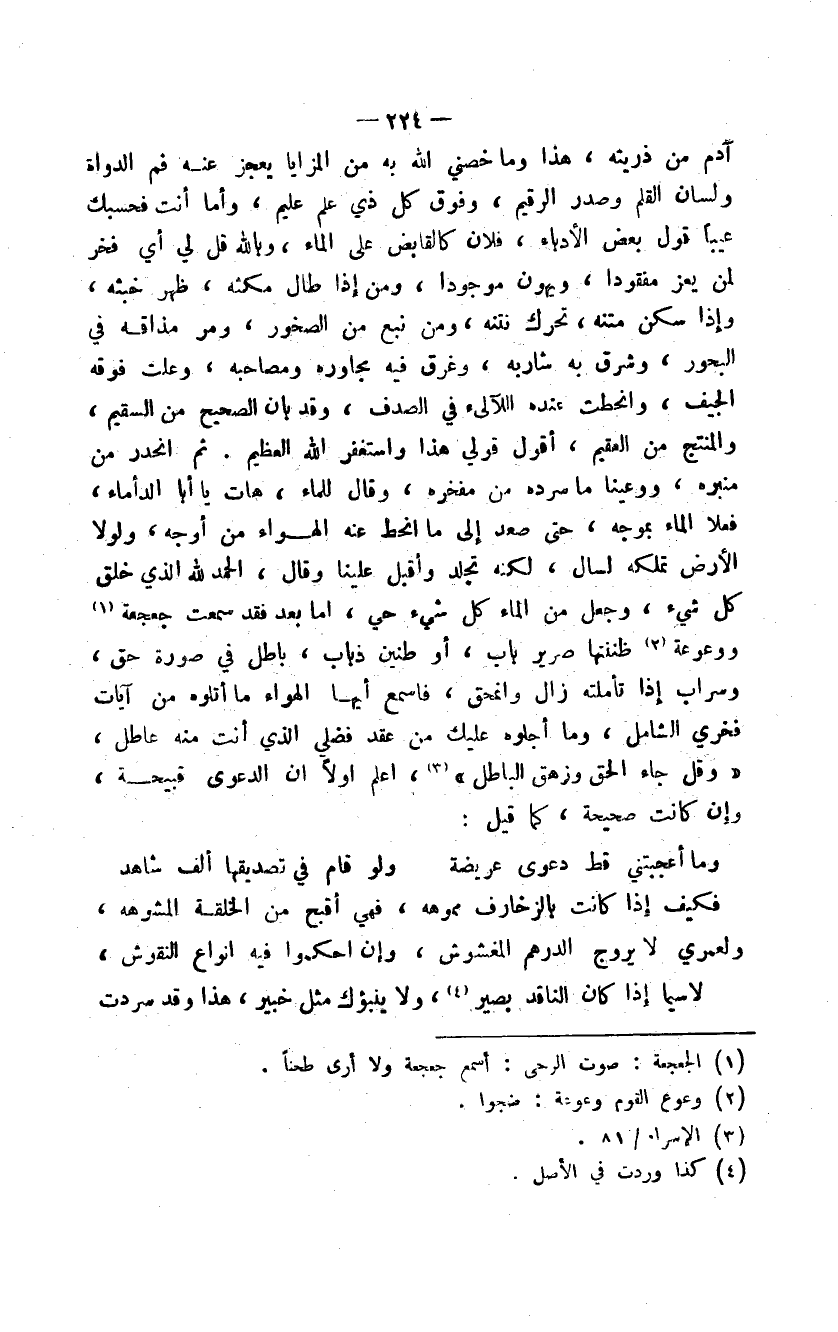 آدم من ذريته، هذا وما خصني الله به من المزايا يعجز عنه فم الدواة ولسان القلم وصدر الرقيم، وفوق كل ذي علم عليم، وأما أنت فحسبك عيباً قول بعض الأدباء، فلان كالقابض على الماء، وبالله قل لي أي فخر لمن يعز مفقوداً، ويهون موجوداً، ومن إذا طال مكثه، ظهر خبثه، وإذا سكن متنه، تحرك نتنه، ومن نبع من الصخور، ومر مذاقه في البحور، وشرق به شاربه، وغرق فيه مجاوره ومصاحبه، وعلت فوقه الجيف، وانحطت عنده اللآلىء في الصدف، وقد بان الصحيح من السقيم، والمنتج من العقيم، أقول قولي هذا وأستغفر الله العظيم. ثم انحدر من منبره، ووعينا ما سرده من مفخره، وقال للماء، هات يا أبا الدأماء، فعلا الماء بموجه، حتى صعد إلى ما انحط عنه الهواء من أوجه، ولولا الأرض تملكه لسال، لكنه تجلد وأقبل علينا وقال، الحمد لله الذي خلق كل شيء، وجعل من الماء كل شيء حي، أما بعد فقد سمعت جعجعة ووعوعة ظننتها صرير باب، أو طنين ذباب، باطل في صورة حق، وسراب إذا تأملته زال وانمحق، فاسمع أيها الهواء ما أتلوه من آيات فخري الشامل، وما أجلوه عليك من عقد فضلي الذي أنت منه عاطل، " وقل جاء الحق وزهق الباطل "، اعلم أولاً أن الدعوى قبيحة، وإن كانت صحيحة، كما قيل: