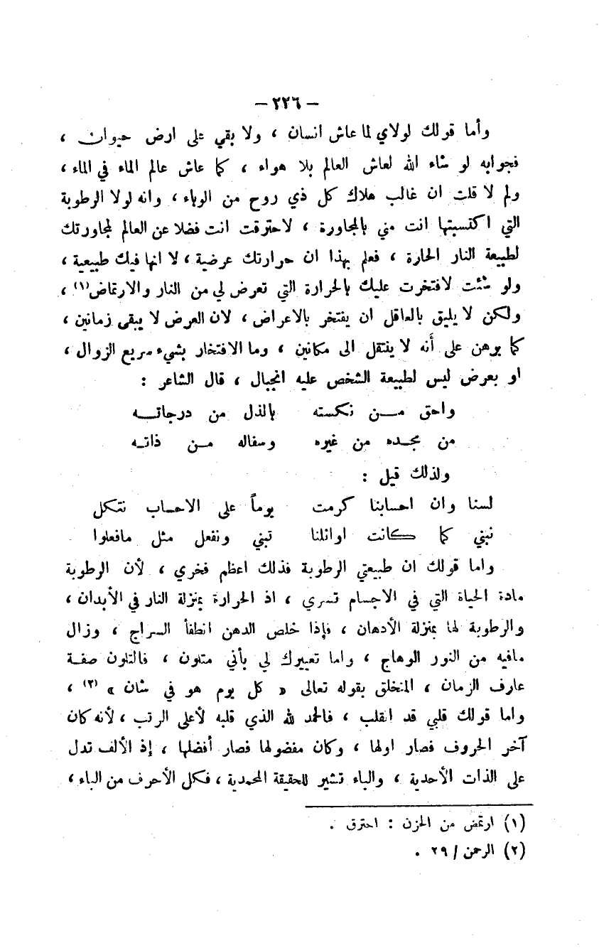 وأما قولك إن طبيعتي الرطوبة فذلك أعظم فخري، لأن الرطوبة مادة الحياة التي في الأجسام تسري، إذ الحرارة بمنزلة النار في الأبدان، والرطوبة لها بمنزلة الأدهان، فإذا خلص الدهن انطفأ السراج، وزال ما فيه من النور الوهاج، وأما تعييرك لي بأني متلون، فالتلون صفة عارف الزمان، المتخلق بقوله تعالى " كل يوم هو في شأن "، وأما قولك قلبي قد انقلب، فالحمد لله الذي قلبه لأعلى الرتب، لأنه كان آخر الحروف فصار أولها، وكان مفضولها فصار أفضلها، إذ الألف تدل على الذات الأحدية، والباء تشير للحقيقة المحمدية، فكل الأحرف من الباء،