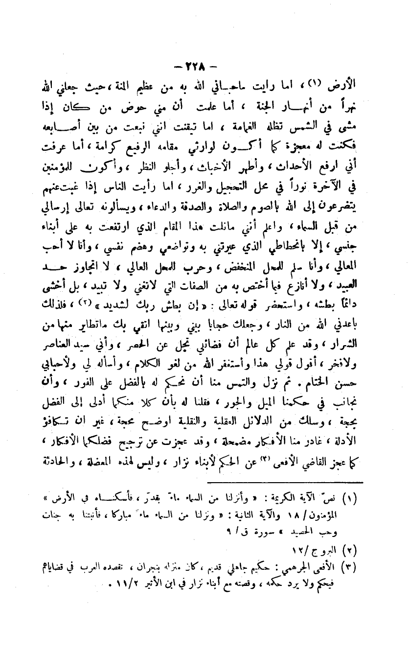 الأرض "، أما رأيت ما حباني الله به من عظيم المنة، حيث جعلني الله نهراً من أنهار الجنة، أما علمت أن مني حوض من كان إذا مشى في الشمس تظله الغمامة، أما تيقنت أنني نبعت من بين أصابعه فكنت له معجزة كما أكون لوارثي مقامه الرفيع كرامة، أما عرفت أني أرفع الأحداث، وأطهر الأخباث، وأجلو النظر، وأكون للمؤمنين في الآخرة نوراً في محل التحجيل والغرر، أما رأيت الناس إذا غبت عنهم يتضرعون إلى الله بالصوم والصلاة والصدقة والدعاء، ويسألونه تعالى إرسالي من قبل السماء، واعلم أنني ما نلت هذا المقام الذي ارتفعت به على أبناء جنسي، إلا بانحطاطي الذي عيرتني به وتواضعي وهضم نفسي، وأنا لا أحب المعالي، وأنا سلم للمحل المنخفض، وحرب للمحل العالي، لا أتجاوز حد العبيد، ولا أنازع فيما أختص به من الصفات التي لا تغني ولا تبيد، بل أخشى دائماً بطشه، وأستحضر قوله تعالى: " إن بطش ربك لشديد "، فلذلك باعدني الله من النار، وجعلك حجاباً بيني وبينها أتقي بك ما تطاير منها من الشرار، وقد علم كل عالم أن فضائلي تجل عن الحصر، وأني سيد العناصر ولا فخر، أقول قولي هذا وأستغفر الله من لغو الكلام، وأسأله لي ولأحبابي حسن الختام. ثم نزل والتمس منا أن نحكم له بالفضل على الفور، وأن نجانب في حكمنا الميل والجور، فقلنا له بأن كلاً منكما أدلى إلى الفضل بحجة، وسلك من الدلائل العقلية والنقلية أوضح محجة، غير أن تكافؤ الأدلة، غدر منا الأفكار مضمحلة، وقد عجزت عن ترجيح فضلكما الأفكار، كما عجز القاضي الأفعى عن الحكم لأبناء نزار، وليس لهذه المعضلة، والحادثة