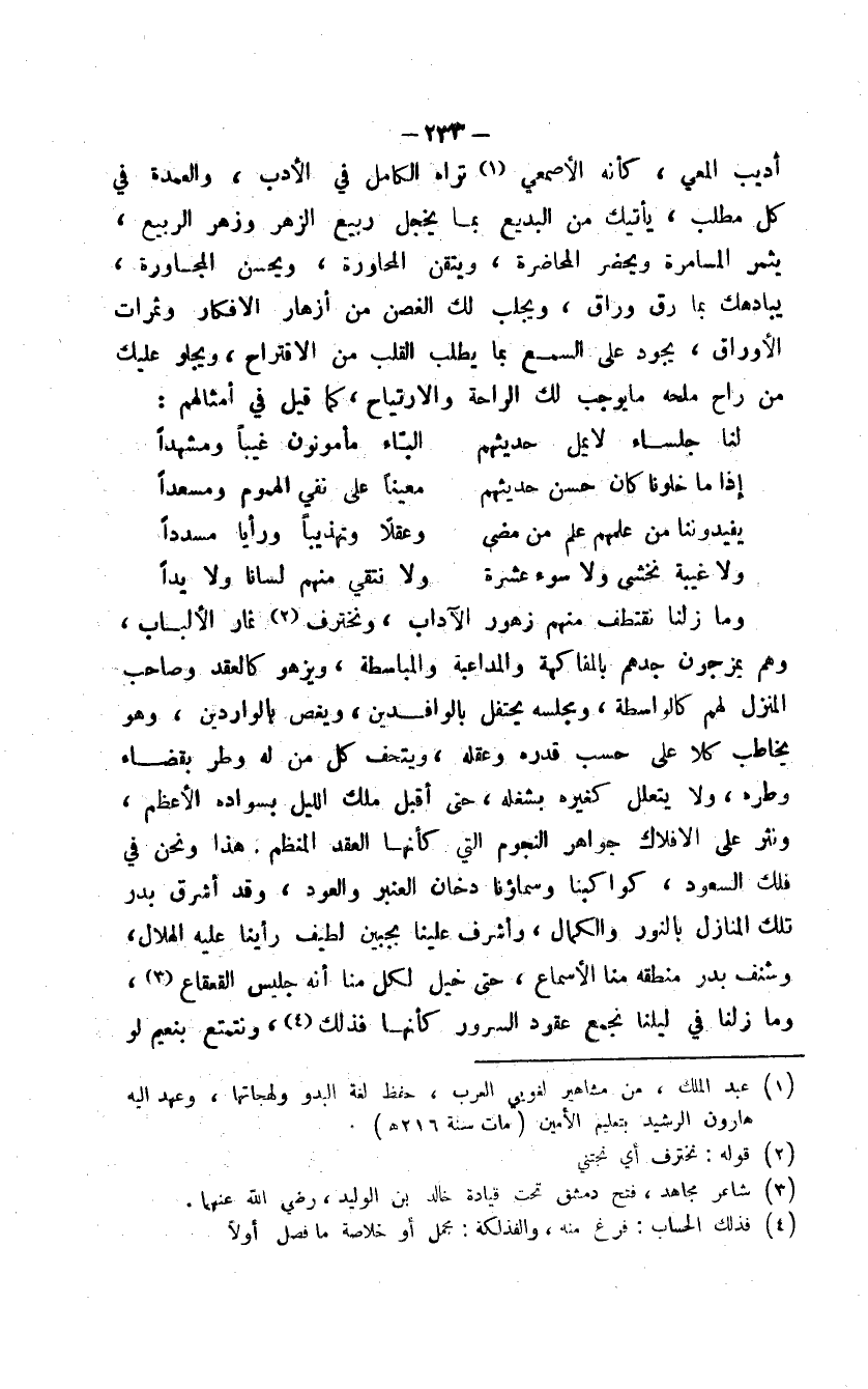 أديب ألمعي، كأنه الأصمعي تراه الكامل في الأدب، والعمدة في كل مطلب، يأتيك من البديع بما يخجل ربيع الزهر وزهر الربيع، يثمر المسامرة ويحضر المحاضرة، ويتقن المحاورة، ويحسن المجاورة، يبادهك بما رق وراق، ويجلب لك الغصن من أزهار الأفكار وثمرات الأوراق، يجود على السمع بما يطلب القلب من الاقتراح، ويجلو عليك من راح ملحه ما يوجب لك الراحة والارتياح، كما قيل في أمثالهم: