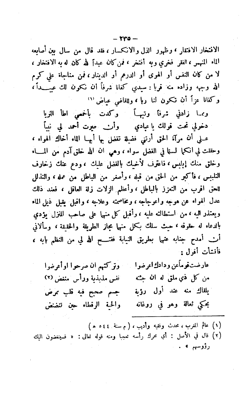 الافتخار الافتقار، وظهور الذل والانكسار، فقد قال من سال بين أصابعه الماء المنهمر، الفقر فخري وبه أفتخر، فمن كان عبداً لله كان له به الافتخار، لا من كان النفس أو الهوى أو الدرهم أو الدينار، فمن مناجاة علي كرم الله وجهه وزاده منه قرباً: سيدي كفانا شرفاً أن نكون لك عبيداً، وكفانا عزاً أن تكون لنا رباً، وللقاضي عياض