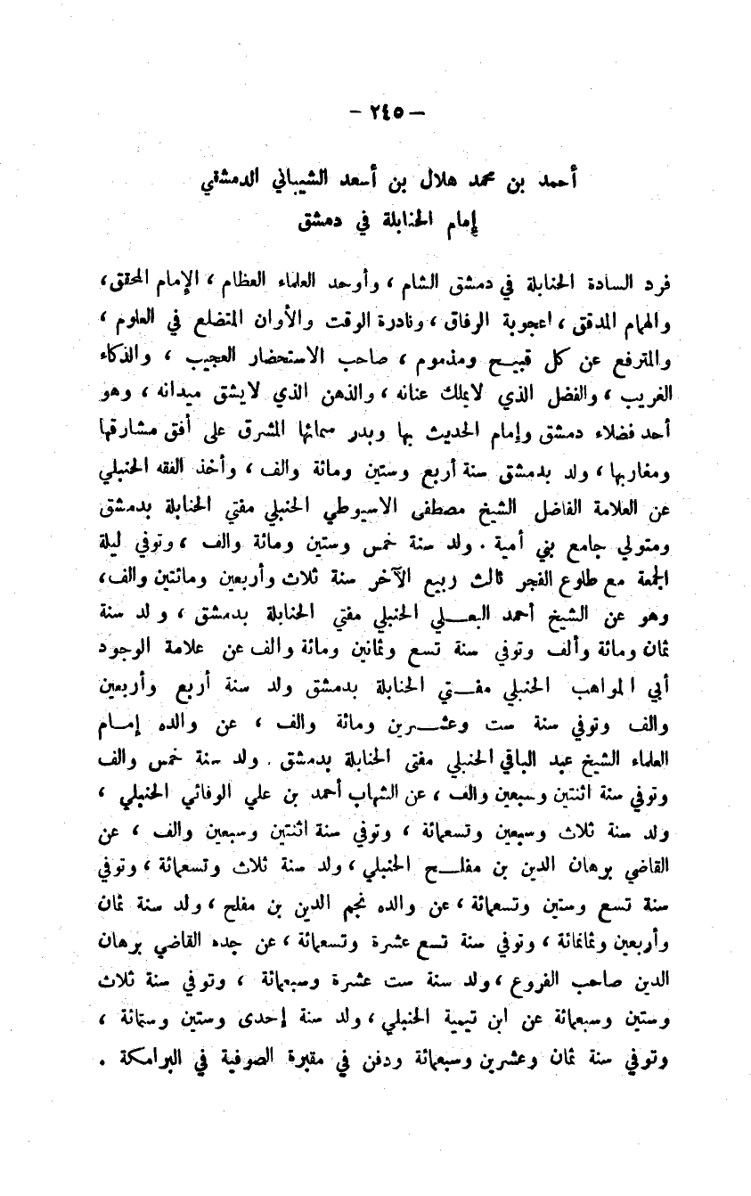 فرد السادة الحنابلة في دمشق الشام، وأوحد العلماء العظام، الإمام المحقق، والهمام المدقق، أعجوبة الرفاق، ونادرة الوقت والأوان المتضلع في العلوم، والمترفع عن كل قبيح ومذموم، صاحب الاستحضار العجيب، والذكاء الغريب، والفضل الذي لا يملك عنانه، والذهن الذي لا يشق ميدانه، وهو أحد فضلاء دمشق وإمام الحديث بها وبدر سمائها المشرق على أفق مشارقها ومغاربها، ولد بدمشق سنة أربع وستين ومائة وألف، وتوفي ليلة الجمعة مع طلوع الفجر ثالث ربيع الآخر سنة ثلاث وأربعين ومائتين وألف، وهو عن الشيخ أحمد البعلي الحنبلي مفتي الحنابلة بدمشق، ولد سنة ثمان ومائة وألف وتوفي سنة تسع وثمانين ومائة وألف عن علامة الوجود أبي المواهب الحنبلي مفتي الحنابلة بدمشق ولد سنة أربع وأربعين وألف وتوفي سنة ست وعشرين ومائة وألف، عن والده إمام العلماء الشيخ عبد الباقي الحنبلي مفتي الحنابلة بدمشق. ولد سنة خمس وألف وتوفي سنة اثنتين وسبعين وألف، عن الشهاب أحمد بن علي الوفائي الحنبلي، ولد سنة ثلاث وسبعين وتسعمائة، وتوفي سنة اثنتين وسبعين وألف، عن القاضي برهان الدين بن مفلح الحنبلي، ولد سنة ثلاث وتسعمائة، وتوفي سنة تسع وستين وتسعمائة، عن والده نجم الدين بن ملفح، ولد سنة ثمان وأربعين وثمانمائة، وتوفي سنة تسع عشرة وتسعمائة، عن جده القاضي برهان الدين صاحب الفروع، ولد سنة ست عشرة وسبعمائة، وتوفي سنة ثلاث وستين وسبعمائة عن ابن تيمية الحنبلي، ولد سنة إحدى وستين وستمائة، وتوفي سنة ثمان وعشرين وسبعمائة ودفن في مقبرة الصوفية في البرامكة.
