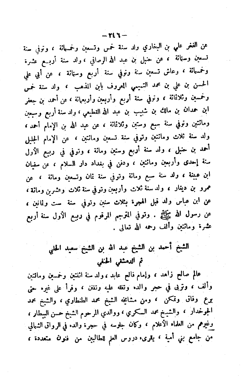 عن الفخر علي بن البخاري ولد سنة خمس وتسعين وخمسمائة، وتوفي سنة تسعين وستمائة، عن حنبل بن عبد اله الرصافي، ولد سنة أربع عشرة وخمسمائة، وعاش تسعين سنة وتوفي سنة أربع وستمائة، عن أبي علي الحسن بن علي بن محمد التميمي المعروف بابن المذهب، ولد سنة خمس وخمسين وثلاثمائة، وتوفي سنة أربع وأربعين وأربعمائة، عن أحمد بن جعفر ابن حمدان بن مالك بن شبيب بن عبد الله القطيعي، ولد سنة أربع وسبعين ومائتين وتوفي سنة سبع وستين وثلاثمائة، عن عبد الله بن الإمام أحمد، ولد سنة ثلاث ومائتين وتوفي سنة تسعين ومائتين، عن الإمام الجليل أحمد بن حنبل، ولد سنة أربع وستين ومائة، وتوفي في ربيع الأول سنة إحدى وأربعين ومائتين، ودفن في بغداد دار السلام، عن سفيان ابن عيينة، ولد سنة سبع ومائة وتوفي سنة ثمان وتسعين ومائة، عن عمرو بن دينار، ولد سنة ثلاث وأربعين وتوفي سنة ثلاث وعشرين ومائة، عن ابن عباس ولد قبل الهجرة بثلاث سنين وتوفي سنة ست وثمانين، عن رسول الله صلى الله عليه وسلم. وتوفي المترجم المرقوم في ربيع الأول سنة أربع عشرة ومائتين وألف رحمه الله تعالى.