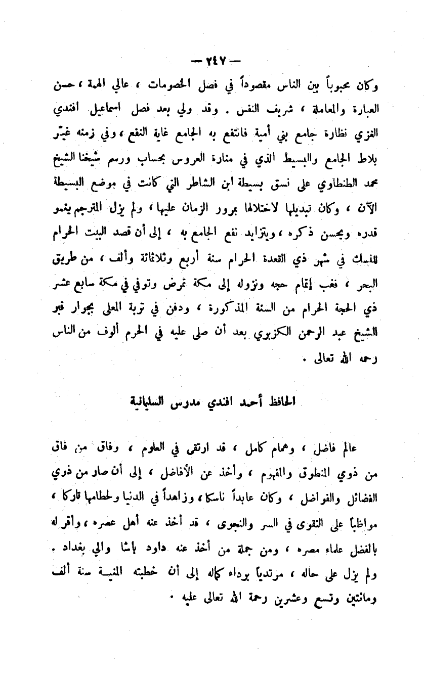 عالم فاضل، وهمام كامل، قد ارتقى في العلوم، وفاق من فاق من ذوي المنطوق والمفهوم، وأخذ عن الأفاضل، إلى أن صار من ذوي الفضائل والفواضل، وكان عابداً ناسكاًن وزاهداً في الدنيا ولحطامها تاركاً، مواظباً على التقوى في السر والنجوى، قد أخذ عنه أهل عصره، واقر له بالفضل علماء مصره، ومن جملة من أخذ عنه داود باشا والي بغداد. ولم يزل على حاله، مرتدياً برداء كماله إلى أن خطبته المنية سنة ألف ومائتين وتسع وعشرين رحمة الله تعالى عليه.