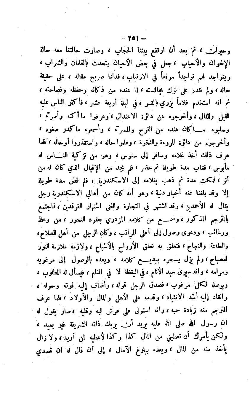 وحيران، ثم بعد أن ارتفع بيننا الحجاب، وصارت حالتنا معه حالة الإخوان والأحباب، جعل في بعض الأحيان يتحدث بالغلمان والشراب، ويتواجد لهم تواجداً موقعاً في الارتياب، فدلنا صريح مقاله، على حقيقة حاله، ولم نقدر على ترك مجالسته، لما عنده من ذكائه وحفظه وفصاحته، ثم إنه استخدم غلاماً يزري بالقمر، في ليلة أربعة عشر، فأكثر الناس عليه القيل والقال، وأخرجوه عن دائرة الاعتدال، وعرفوا ما أكنه وأسره، وسلبوه ما كان عنده من الفرح والمسرة، وأسمعوه ما كدر صفوه، وأخرجوه من دائرة المروءة والنخوة، وعلموا حاله، واستقذروا أوحاله، فلما عرف ذلك أخذ غلامه وسافر إلى سنوس، وهو من تزكية الناس له مأيوس، فغاب مدة طويلة ثم حضر، فلم يجد من الإقبال الذي كان له من أثر، فمكث مدة ثم ذهب بغلامه إلى الاسكندرية، فلم تمض مدة طويلة إلا وقد بلغنا عنه أخبار دنية، وهو أنه كان من أهالي الاسكندرية رجل يقال له الأحمدين، وقد اشتهر في التجارة والغنى اشتهار الفرقدين، فاجتمع بالمترجم المذكور، وسمع من كلامه المزدري بعقود النحور، من وعظ ورغائب، ودعوى وصول إلى أعلى المراتب، وكان الرجل من أهل الصلاح، والطاعة والنجاح، فتعلق به تعلق الأرواح بالأشباح، ولازمه ملازمة النور للمصباح، ولم يزل يسحره ببديع كلامه، ويعده بالوصول إلى مرغوبه ومرامه، وأنه سيرى سيد الأنام، في اليقظة لا في المنام، فيسأل له المطلوب، ويوصله لكل مرغوب، فصدق الرجل قوله، وأضاف إليه قوته وحوله، وانقاد إليه أشد الانقياد، وقدمه على الأهل والمال والأولاد، فلما عرف المترجم منه زيادة حبه، وأنه استولى على عرش لبه وقلبه، صار يقول له إن رسول الله صلى الله عليه يريد أن يريك ذاته الشريفة غير بعيد، ولكن يأمرك أن تعطيني من المال كذا وكذا لأعطيه لمن أريد، ولا زال يأخذ منه من المال، ويعده ببلوغ الآمال، إلى أن قال له إن قصدي