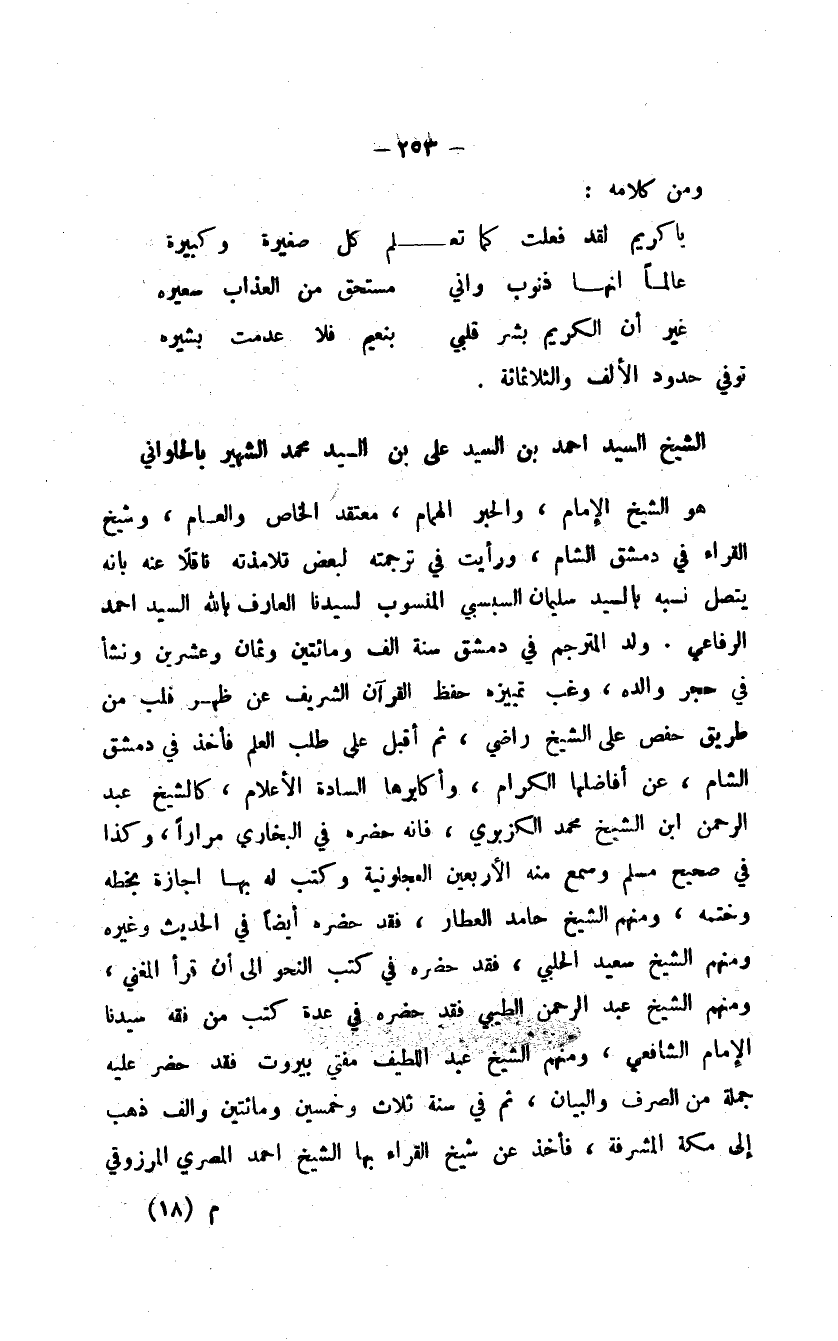 هو الشيخ الإمام، والحبر الهمام، معتقد الخاص والعام، وشيخ القراء في دمشق الشام، ورأيت في ترجمته لبعض تلامذته ناقلاً عنه بأنه يتصل نسبه بالسيد سليمان السبسبي المنسوب لسيدنا العارف بالله السيد أحمد الرفاعي. ولد المترجم في دمشق سنة ألف ومائتين وثمان وعشرين ونشأ في حجر والده، وغب تمييزه حفظ القرآن الشريف عن ظهر قلب من طريق حفص على الشيخ راضي، ثم أقبل على طلب العلم فأخذ في دمشق الشام، عن أفاضلها الكرام، وأكابرها السادة الأعلام، كالشيخ عبد الرحمن ابن الشيخ محمد الكزبري، فإنه حضره في البخاري مراراً، وكذا في صحيح مسلم وسمع منه الأربعين العجلونية وكتب له بها إجازة بخطه وختمه، ومنهم الشيخ حامد العطار، فقد حضره أيضاً في الحديث وغيره ومنهم الشيخ سعيد الحلبي، فقد حضره في كتب النحو إلى أن قرأ المغني، ومنهم الشيخ عبد الرحمن الطيبي فقد حضره في عدة كتب من فقه سيدنا الإمام الشافعي، ومنهم الشيخ عبد اللطيف مفتي بيروت فقد حضر عليه جملة من الصرف والبيان، ثم في سنة ثلاث وخمسين ومائتين وألف ذهب إلى مكة المشرفة، فأخذ عن شيخ القراء بها الشيخ أحمد المصري المرزوقي