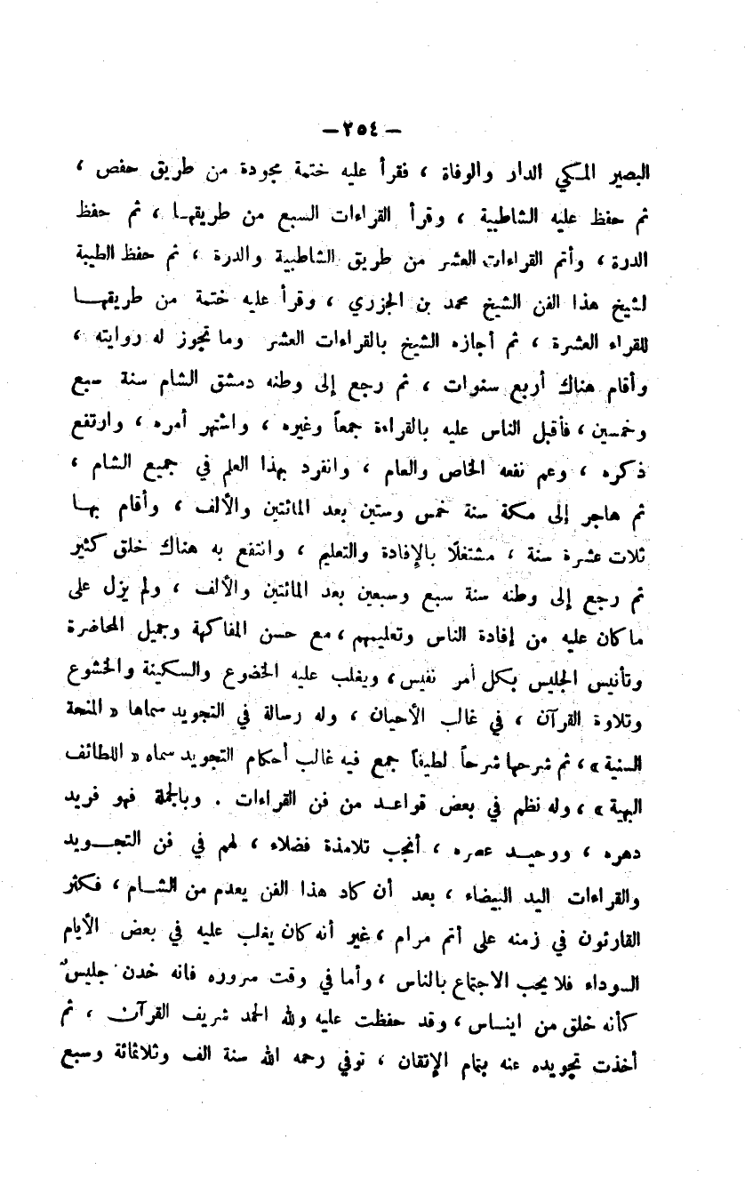 البصير المكي الدار والوفاة، فقرأ عليه ختمة مجودة من طريق حفص، ثم حفظ عليه الشاطبية، وقرأ القراءات السبع من طريقها، ثم حفظ الدرة، وأتم القراءات العشر من طريق الشاطبية والدرة، ثم حفظ الطيبة لشيخ هذا الفن الشيخ محمد بن الجزري، وقرأ عليه ختمة من طريقها للقراء العشرة، ثم أجازه الشيخ بالقراءات العشر وما تجوز له روايته، وأقام هناك أربع سنوات، ثم رجع إلى وطنه دمشق الشام سنة سبع وخمسين، فأقبل الناس عليه بالقراءة جمعاً وغيره، واشتهر أمره، وارتفع ذكره، وعم نفعه الخاص والعام، وانفرد بهذا العلم في جميع الشام، ثم هاجر إلى مكة سنة خمس وستين بعد المائتين والألف، وأقام بها ثلاث عشرة سنة، مشتغلاً بالإفادة والتعليم، وانتفع به هناك خلق كثير ثم رجع إلى وطنه سنة سبع وسبعين بعد المائتين والألف، ولم يزل على ما كان عليه من إفادة الناس وتعليمهم، مع حسن المفاكهة وجميل المحاضرة وتأنيس الجليس بكل أمر نفيس، ويغلب عليه الخضوع والسكينة والخشوع وتلاوة القرآن، في غالب الأحيان، وله رسالة في التجويد سماه اللطائف البهية، وله نظم في بعض قواعد من فن القراءات. وبالجملة فهو فريد دهره، ووحيد عصره، أنجب تلامذة فضلاء، لهم في فن التجويد والقراءات اليد البيضاء، بعد أن كاد هذا الفن يعدم من الشام، فكثر القارئون في زمنه على أتم مرام، غير أنه كان يغلب عليه في بعض الأيام السوداء فلا يحب الاجتماع بالناس، وأما في وقت سروره فإنه خدن جليسٌ كأن خلق من إيناس، وقد حفظت عليه ولله الحمد شريف القرآن، ثم أخذت تجويده عنه بتمام الإتقان، توفي رحمه الله سنة ألف وثلاثمائة وسبع