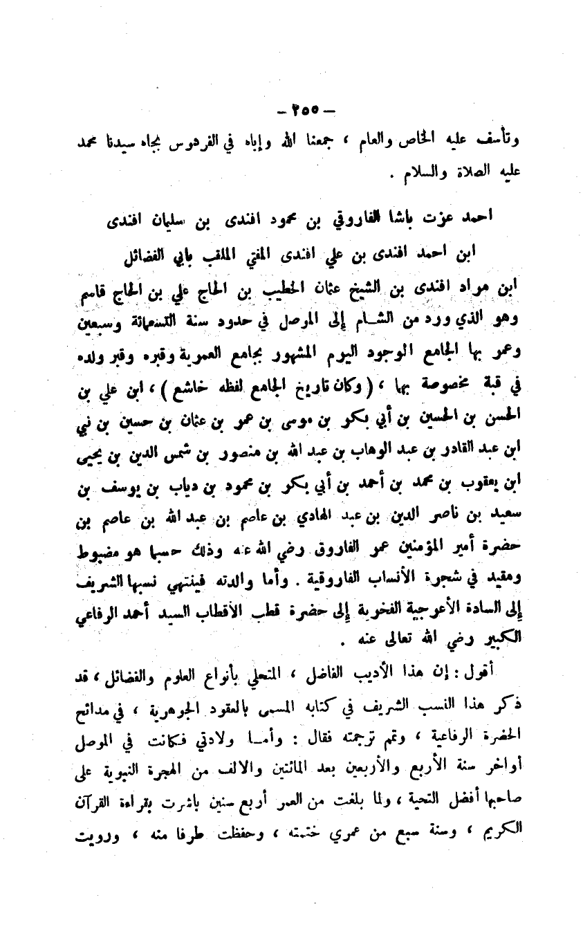 ابن مراد أفندي بن الشيخ عثمان الخطيب بن الحاج علي بن الحاج قاسم وهو الذي ورد من الشام إلى الموصل في حدود سنة التسعمائة وسبعين وعمر بها الجامع الوجود اليوم المشهور بجامع العمرية وقبره وقبر ولده في قبة مخصوصة بهما، (وكان تاريخ الجامع لفظه خاشع) ، ابن علي بن الحسن بن الحسين بن أبي بكر بن موسى بن عمر بن عثمان بن حسين بن نبي ابن عبد القادر بن عبد الوهاب بن عبد الله بن منصور بن شمس الدين بن يحيى ابن يعقوب بن محمد بن أحمد بن أبي بكر بن محمود بن دياب بن يوسف بن سعيد بن ناصر الدين بن عبد الهادي بن عاصم بن عبد الله بن عاصم بن حضرة أمير المؤمنين عمر الفاروق رضي الله عنه وذلك حسبما هو مضبوط ومقيد في شجرة الأنساب الفاروقية. وأما والدته فينتهي نسبها الشريف إلى السادة الأعوجية الفخرية إلى حضرة قطب الأقطاب السيد أحمد الرفاعي الكبير رضي الله تعالى عنه.