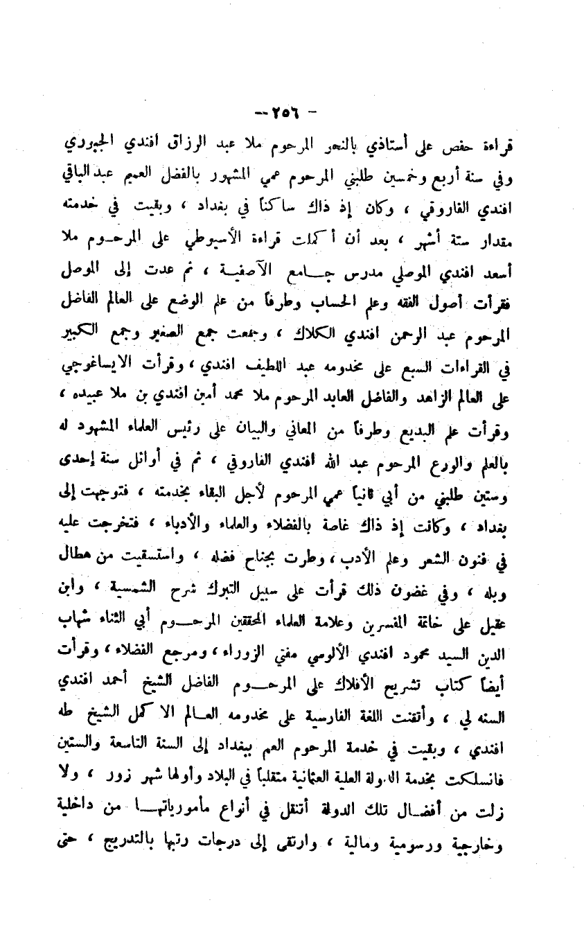 قراءة حفص على أستاذي بالنحو المرحوم ملا عبد الرزاق أفندي الجبوري وفي سنة أربع وخمسين طلبني المرحوم عمي المشهور بالفضل العميم عبد الباقي أفندي الفاروقي، وكان إذ ذاك ساكناً في بغداد، وبقيت في خدمته مقدار ستة أشهر، بعد أن أكملت قراءة الأسيوطي على المرحوم ملا أسعد أفندي الموصلي مدرس جامع الآصفية، ثم عدت إلى الموصل فقرأت أصول الفقه وعلم الحساب وطرفاً من علم الوضع على العالم الفاضل المرحوم عبد الرحمن أفندي الكلاك، وجمعت جمع الصغير وجمع الكبير في القراءات السبع على مخدومه عبد اللطيف أفندي، وقرأت الإيساغوجي على العالم الزاهد والفاضل العابد المرحوم ملا محمد أمين أفندي بن ملا عبيده، وقرأت علم البديع وطرفاً من المعاني والبيان على رئيس العلماء المشهود له بالعلم والورع المرحوم عبد الله أفندي الفاروقي، ثم في أوائل سنة إحدى وستين طلبني من أبي ثانياً عمي المرحوم لأجل البقاء بخدمته، فتوجهت إلى بغداد، وكانت إذ ذاك غاصة بالفضلاء والعلماء والأدباء، فتخرجت عليه في فنون الشعر وعلم الأدب، وطرت بجناح فضله، واستسقيت من هطال وبله، وفي غضون ذلك قرأت على سبيل التبرك شرح الشمسية، وابن عقيل على خاتمة المفسرين وعلامة العلماء المحققين المرحوم أبي الثناء شهاب الدين السيد محمود أفندي الألوسي مفتي الزوراء ومرجع الفضلاء، وقرأت أيضاً كتاب تشريح الأفلاك على المرحوم الفاضل الشيخ أحمد أفندي السنة لي، وأتقنت اللغة الفارسية على مخدومه العالم الأكمل الشيخ طه أفندي، وبقيت في خدمة المرحوم العم ببغداد إلى السنة التاسعة والستين فانسلكت بخدمة الدولة العلية العثمانية متقلباً في البلاد وأولها شهر زور، ولا زلت من أفضال تلك الدولة أتنقل في أنواع مأمورياتها من داخلية وخارجية ورسومية ومالية، وارتقى إلى درجات رتبها بالتدريج، حتى