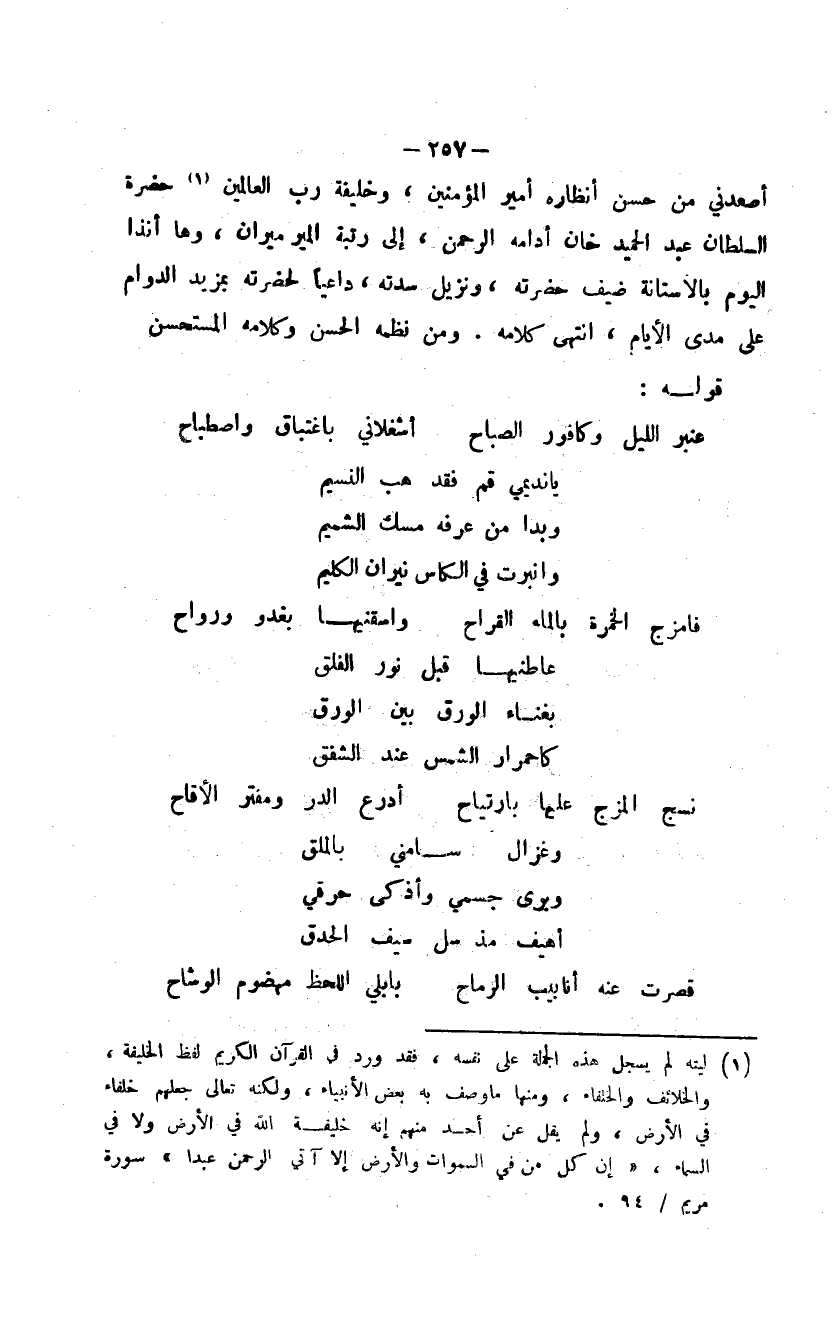 أصعدني من حسن أنظاره أمير المؤمنين، وخليفة رب العالمين حضرة السلطان عبد الحميد خان أدامه الرحمن، إلى رتبة المير ميران، وها أنذا اليوم بالآستانة ضيف حضرته، ونزيل سدته، داعياً لحضرته بمزيد الدوام على مدى الأيام، انتهى كلامه. ومن نظمه الحسن وكلامه المستحسن قوله: