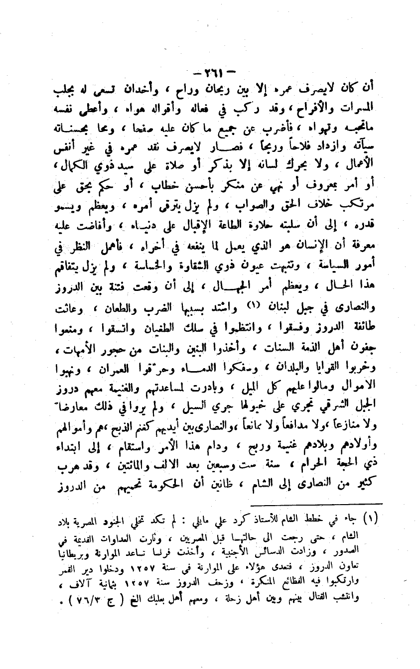 أن كان لا يصرف عمره إلا بين ريحان وراح، وأخدان تسعى له بجلب المسرات والأفراح، وقد ركب في فعاله وأقواله هواه، وأعطى نفسه ما تحبه وتهواه، فأضرب عن جميع ما كان عليه صفحاً، ومحا بحسناته سيآته وازداد فلاحاً وربحاً، فصار لا يصرف نقد عمره في غير أنفس الأعمال، ولا يحرك لسانه إلا بذكر أو صلاة على سيد ذوي الكمال، أو أمر بمعروف أو نهي عن منكر بأحسن خطاب، أو حكم بحق على مرتكب خلاف الحق والصواب، ولم يزل يترقى أمره، ويعظم ويسمو قدره، إلى أن سلبته حلاوة الطاعة الإقبال على دنياه، وأفاضت عليه معرفة أن الإنسان هو الذي يعمل لما ينفعه في أخراه، فأهمل النظر في أمور السياسة، وتنبهت عيون ذوي الشقاوة والخساسة، ولم يزل يتفاقم هذا الحال، ويعظم أمر الجهال، إلى أن وقعت فتنة بين الدروز والنصارى في جبل لبنان واشتد بسببها الضرب والطعان، وعاثت طائفة الدروز وفسقوا، وانتظموا في سلك الطغيان واتسقوا، ومنعوا جفون أهل الذمة السنات، وأخذوا البنين والبنات من حجور الأمهات، وخربوا القرايا والبلدان، وسفكوا الدماء وحرقوا العمران، ونهبوا الأموال ومالوا عليهم كل الميل، وبادرت لمساعدتهم والغنيمة معهم دروز الجبل الشرقي تجري على خيولها جري السيل، ولم يروا في ذلك معارضاً ولا منازعاً، ولا مدافعاً ولا ممانعاً، والنصارى بين أيديهم كغنم الذبح، هم وأموالهم وأولادهم وبلادهم غنيمة وربح، ودام هذا الأمر واستقام، إلى ابتداء ذي الحجة الحرام، سنة ست وسبعين بعد الألف والمائتين، وقد هرب كثير من النصارى إلى الشام، ظانين أن الحكومة تحميهم من الدروز