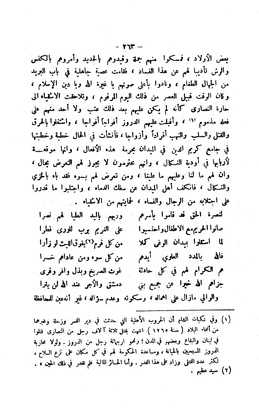 بعض الأولاد، فمسكوا منهم جملة وقيدوهم بالحديد وأمروهم بالكنس والرش تأديباً لهم عن هذا الفساد، فقامت عصبة جاهلية في باب البريد من الجهال الطغام، ونادوا بأعلى صوتهم يا غيرة الله ويا دين الإسلام، وكان الوقت قبيل العصر من ذلك اليوم المرقوم، وتلاحقت الأشقياء إلى حارة النصارى كأنه لم يكن عليهم بعد ذلك عتب ولا أحد منهم على فعله مذموم، وأقبلت عليهم الدروز أفواجاً أفواجا، واشتغلوا بالحرق والقتل والسلب والنهب أفراداً وأزواجا، فأنشأت في الحال خطبة وخطبتها في جامع كريم الدين في الميدان بحرمة هذه الأفعال، وأنها موقعة لأربابها في أودية النكال، وأنهم محترمون لا يجوز لهم التعرض بحال، وأن لهم ما لنا وعليهم ما علينا، ومن تعرض لهم بسوء فقد باء بالخزي والنكال، فانكف أهل الميدان عن سفك الدماء، واجتلبوا ما قدروا على اجتلابه من الرجال والنساء، لحمايتهم من الأشقياء.
