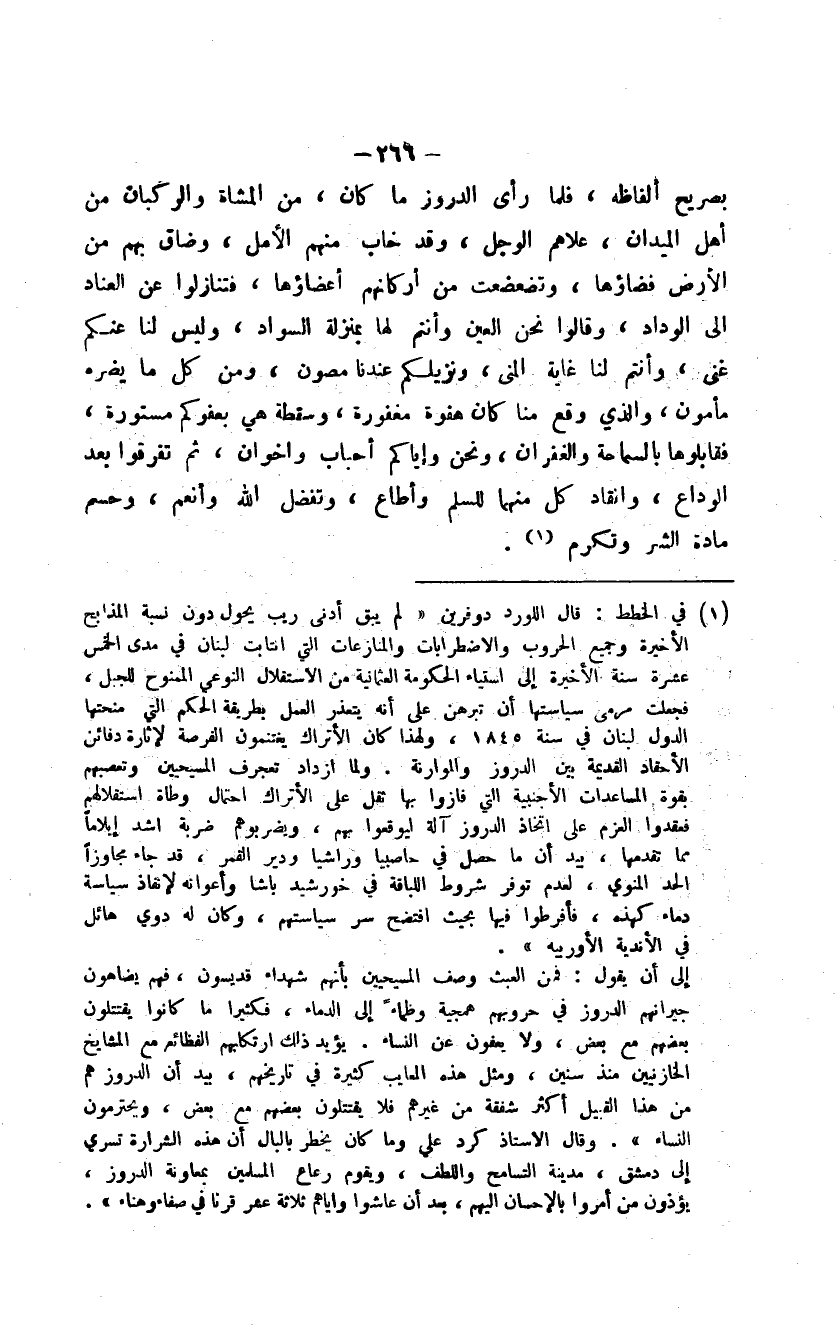 بصريح ألفاظه، فلما رأى الدروز ما كان، من المشاة والركبان من أهل الميدان، علاهم الوجل، وقد خاب منهم الأمل، وضاق بهم من الأرض فضاؤها، وتضعضعت من أركانهم أعضاؤها، فتنازلوا عن العناد إلى الوداد، وقالوا نحن العين وأنتم لها بمنزلة السواد، وليس لنا عنكم غنى، وأنتم لنا غاية المنى، ونزيلكم عندنا مصون، ومن كل ما يضره مأمون، والذي وقع منا كان هفوة مغفورة، وسقطة هي بعفوكم مستورة، فقابلوها بالسماحة والغفران، ونحن وإياكم أحباب وإخوان، ثم تفرقوا بعد الوداع، وانقاد كل منهما للسلم وأطاع، وتفضل الله وأنعم، وحسم مادة الشر وتكرم.