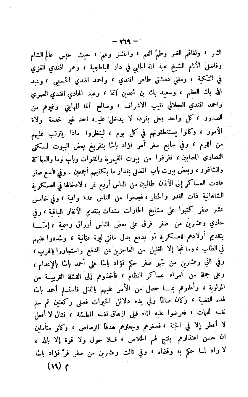 المصابين، ففرغوا من بيوت القيمرية والقنوات وباب توما والسماكة والشاغور، وبعض بيوت باب المصلى بمقدار ما يكفيهم أجمعين. وفي تاسع صفر عادت العساكر إلى الأثمان طالبين من الناس أربع نمر، لإدخالها في العسكرية الشاهانية ذات القدر والخطر، فجمعوا من الناس عدة وافية، وفي خامس عشر صفر كتبوا على مشايخ الحارات سندات بتقديم الأنفار الباقية، وفي حادي وعشرين من صفر فرق على بعض الناس أوراق رسمية، إما بتقديم أولادهم للعسكرية أو بدفع بدل مائتي ليرة عثمانية، وشددوا عليهم في الطلب، وما نجا إلا القليل من العاجزين عن الدفع واستجاروا بالهرب، وفي ثاني وعشرين من شهر صفر حكم فؤاد باشا على أحمد باشا بالإعدام، وعلى جملة من أمراء عساكر النظام، فأخذوهم إلى القشلة القريبة من المولوية، وأعلموهم بما حصل من الأمر عليهم بالقتل فاستسلم أحمد باشا لهذه القضية، وكان صائماً وفي يده دلائل الخيرات فصلى ركعتين ثم سلم نفسه للممات، فعرضوا عليه الماء قبل إزهاق نفسه المطمئنة، فقال لا أفعل لا أفطر إلا في الجنة، فصفوهم وجعلوهم هدفاً للرصاص، وكانوا متأملين إن حسن اعتذارهم ينتج لهم الخلاص، فلا حول ولا قوة إلا بالله، لا راد لما حكم به وقضاه، وفي ثالث وعشرين من صفر فر فؤاد باشا