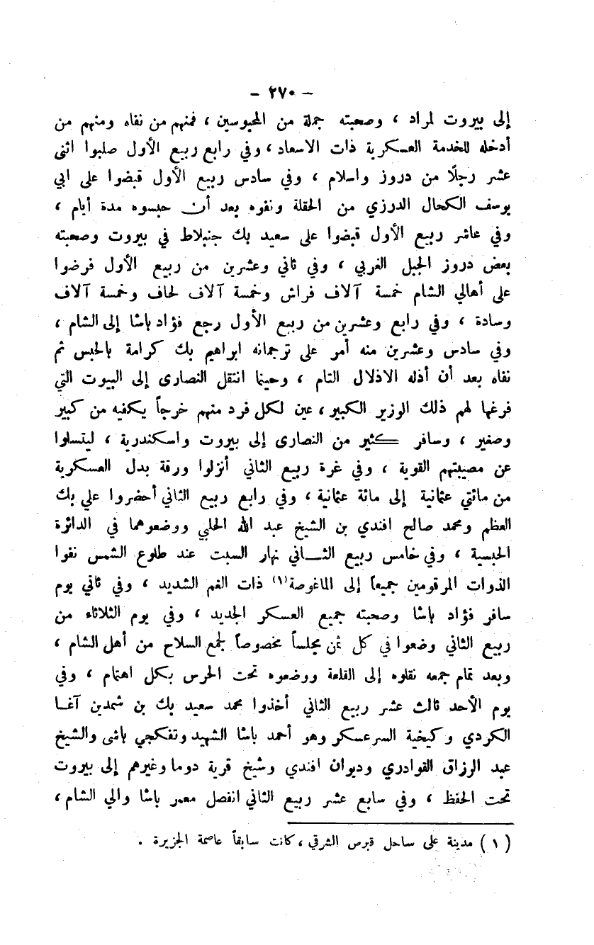 إلى بيروت لمراد، وصحبته جملة من المحبوسين، فمنهم من نفاه ومنهم من أدخله للخدمة العسكرية ذات الإسعاد، وفي رابع ربيع الأول صلبوا اثني عشر رجلاً من دروز وإسلام، وفي سادس ربيع الأول قبضوا على أبي يوسف الكحال الدرزي من الحقلة ونفوه بعد أن حبسوه مدة أيام، وفي عاشر ربيع الأول قبضوا على سعيد بك جنبلاط في بيروت وصحبته بعض دروز الجبل الغربي، وفي ثاني وعشرين من ربيع الأول فرضوا على أهالي الشام خمسة آلاف فراش وخمسة آلاف لحاف وخمسة آلاف وسادة، وفي رابع وعشرين من ربيع الأول رجع فؤاد باشا إلى الشام، وفي سادس وعشرين منه أمر على ترجمانه إبراهيم بك كرامة بالحبس ثم نفاه بعد أن أذله الإذلال التام، وحينما انتقل النصارى إلى البيوت التي فرغها لهم ذلك الوزير الكبير، عين لكل فرد منهم خرجاً يكفيه من كبير وصغير، وسافر كثير من النصارى إلى بيروت واسكندرية، ليتسلوا عن مصيبتهم القوية، وفي غرة ربيع الثاني أنزلوا ورقة بدل العسكرية من مائتي عثمانية إلى مائة عثمانية، وفي رابع ربيع الثاني أحضروا علي بك العظم ومحمد صالح أفندي بن الشيخ عبد الله الحلبي ووضعوهما في الدائرة الحبسية، وفي خامس ربيع الثاني نهار السبت عند طلوع الشمس نفوا الذوات المرقومين جميعاً إلى الماغوصة ذات الغم الشديد، وفي ثاني يوم سافر فؤاد باشا وصحبته جميع العسكر الجديد، وفي يوم الثلاثاء من ربيع الثاني وضعوا في كل ثمن مجلساً مخصوصاً لجمع السلاح من أهل الشام، وبعد تمام جمعه نقلوه إلى القلعة ووضعوه تحت الحرس بكل اهتمام، وفي يوم الأحد ثالث عشر ربيع الثاني أخذوا محمد سعيد بك بن شمدين آغا الكردي وكيخية السر عسكر وهو أحمد باشا الشهيد وتفكجي باشي والشيخ عبد الرزاق القوادري وديوان أفندي وشيخ قرية دوما وغيرهم إلى بيروت تحت الحفظ، وفي سابع عشر ربيع الثاني انفصل معمر باشا والي الشام،