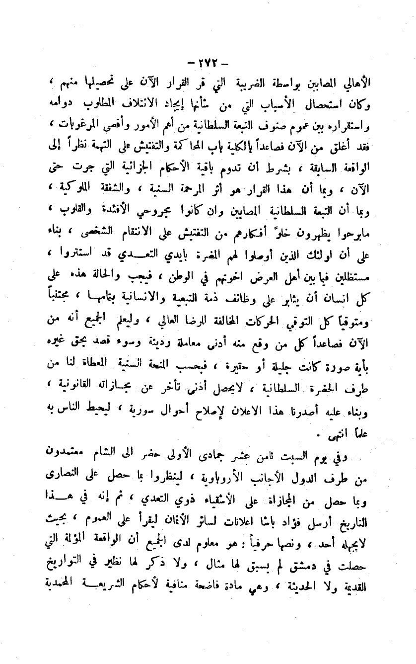 الأهالي المصابين بواسطة الضريبة التي قر القرار الآن على تحصيلها منهم، وكان استحصال الأسباب التي من شأنها إيجاد الائتلاف المطلوب دوامه واستقراره بين عموم صنوف التبعة السلطانية من أهم الأمور وأقصى المرغوبات، فقد أغلق من الآن فصاعداً بالكلية باب المحاكمة والتفتيش على التهمة نظراً إلى الواقعة السابقة، بشرط أن تدوم باقية الأحكام الجزائية التي جرت حتى الآن، وبما أن هذا القرار هو أثر المرحمة السنية، والشفقة الملوكية، وبما أن التبعة السلطانية المصابين وإن كانوا مجروحي الأفئدة والقلوب، ما برحوا يظهرون خلو أفكارهم من التفتيش على الانتقام الشخصي، بناء على أن أولئك الذين أوصلوا لهم المضرة بأيدي التعدي قد استتروا، مستظلين فيما بين أهل العرض إخوتهم في الوطن، فيجب والحالة هذه على كل إنسان أن يثابر على وظائف ذمة التبعية والإنسانية بتمامها، مجتنباً ومتوقياً كل التوقي الحركات المخالفة للرضا العالي، وليعلم الجميع أنه من الآن فصاعداً كل من وقع منه أدنى معاملة رديئة وسوء قصد بحق غيره بأية صورة كانت جليلة أو حقيرة، فبحسب المنحة السنية المعطاة لنا من طرف الحضرة السلطانية، لا يحصل أدنى تأخر عن مجازاته القانونية، وبناء عليه أصدرنا هذا الإعلان لإصلاح أحوال سورية، ليحيط الناس به علماً انتهى.