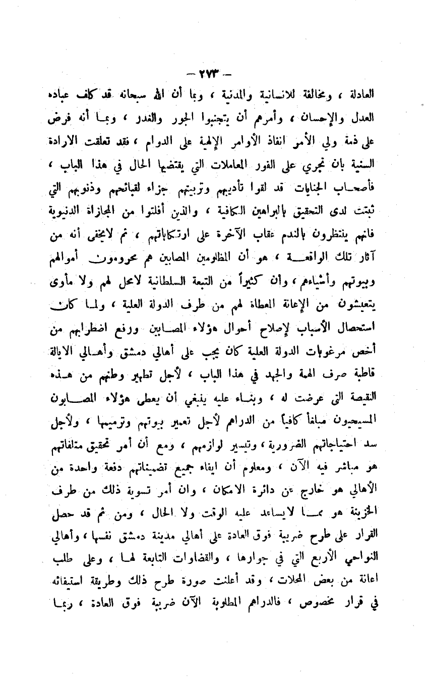 العادلة، ومخالفة للإنسانية والمدنية، وبما أن الله سبحانه قد كلف عباده العدل والإحسان، وأمرهم أن يتجنبوا الجور والغدر، وبما أنه فرض على ذمة ولي الأمر إنفاذ الأوامر الإلهية على الدوام، فقد تعلقت الإرادة السنية بأن تجري على الفور المعاملات التي يقتضيها الحال في هذا الباب، فأصحاب الجنايات قد لقوا تأديبهم وتربيتهم جزاء لقبائحهم وذنوبهم التي ثبتت لدى التحقيق بالبراهين الكافية، والذين أفلتوا من المجازاة الدنيوية فإنهم ينتظرون بالندم عقاب الآخرة على ارتكاباتهم، ثم لا يخفى أنه من آثار تلك الواقعة، هو أن المظلومين المصابين هم محرومون أموالهم وبيوتهم وأشياءهم، وأن كثيراً من التبعية السلطانية لا محل لهم ولا مأوى يتعيشون من الإعانة المعطاة لهم من طرف الدولة العلية، ولما كان استحصال الأسباب لإصلاح أحوال هؤلاء المصابين ورفع اضطرابهم من أخص مرغوبات الدولة العلية كان يجب على أهالي دمشق وأهالي الإيالة قاطبة صرف الهمة والجهد في هذا الباب، لأجل تطهير وطنهم من هذه النقيصة التي عرضت له، وبناء عليه ينبغي أن يعطى هؤلاء المصابون المسيحيون مبلغاً كافياً من الدراهم لأجل تعمير بيوتهم وترميمها، ولأجل سد احتياجاتهم الضرورية، وتيسير لوازمهم، ومع أن أمر تحقيق متلفاتهم هو مباشر فيه الآن، ومعلوم أن إيفاء جميع تضميناتهم دفعة واحدة من الأهالي هو خارج عن دائرة الإمكان، وأن أمر تسوية ذلك من طرف الخزينة هو مما لا يساعد عليه الوقت ولا الحال، ومن ثم قد حصل القرار على طرح ضريبة فوق العادة على أهالي مدينة دمشق نفسها، وأهالي النواحي الأربع التي في جوارها، والقضاوات التابعة لها، وعلى طلب إعانة من بعض المحلات، وقد أعلنت صورة طرح ذلك وطريقة استيفائه في قرار مخصوص، فالدراهم المطلوبة الآن ضريبة فوق العادة، ربما