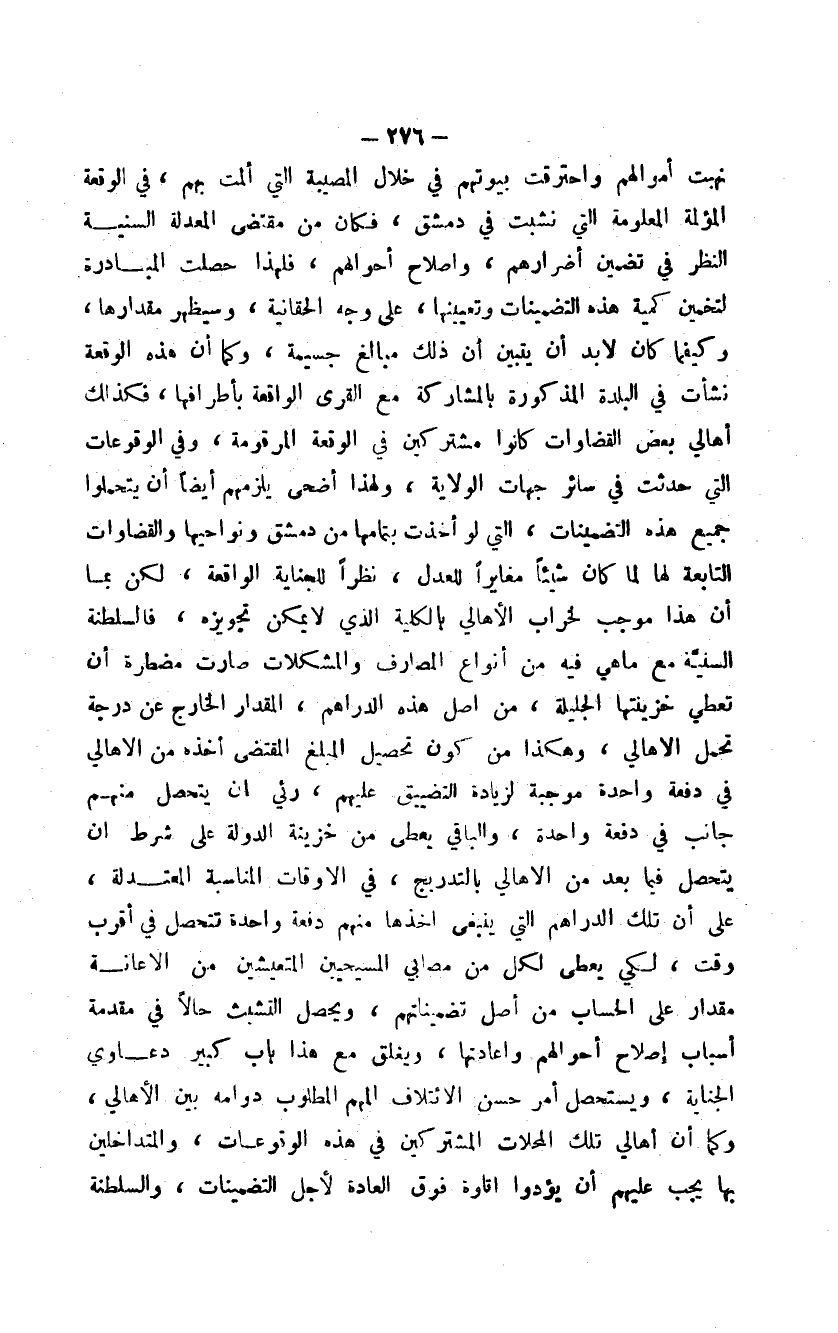 نهبت أموالهم واحترقت بيوتهم في خلال المصيبة التي ألمت بهم، في الوقعة المؤلمة المعلومة التي نشبت في دمشق، فكان من مقتضى المعدلة السنية النظر في تضمين أضرارهم، وإصلاح أحوالهم، فلهذا حصلت المبادرة لتخمين كمية هذه التضمينات وتعيينها، على وجه الحقانية، وسيظهر مقدارها، وكيفما كان لابد أن يتبين أن ذلك مبالغ جسيمة، وكما أن هذه الوقعة نشأت في البلدة المذكورة بالمشاركة مع القرى الواقعة بأطرافها، فكذلك أهالي بعض القضاوات كانوا مشتركين في الوقعة المرقومة، وفي الوقوعات التي حدثت في سائر جهات الولاية، ولهذا أضحى يلزمهم أيضاً أن يتحملوا جميع هذه التضمينات، التي لو أخذت بتمامها من دمشق ونواحيها والقضاوات التابعة لها لما كان شيئاً مغايراً للعدل، نظراً للجناية الواقعة، لكن بما أن هذا موجب لخراب الأهالي بالكلية الذي لا يمكن تجويزه، فالسلطنة السنية مع ما هي فيه من أنواع المصارف والمشكلات صارت مضطرة أن تعطي خزينتها الجليلة، من أصل هذه الدراهم، المقدار الخارج عن درجة تحمل الأهالي، وهكذا من كون تحصيل المبلغ المقتضى أخذه من الأهالي في دفعة واحدة موجبة لزيادة التضييق عليهم، رئي أن يتحصل منهم جانب في دفعة واحدة، والباقي يعطى من خزينة الدولة على شرط أن يتحصل فيما بعد من الأهالي بالتدريج، في الأوقات المناسبة المعتدلة، على أن تلك الدراهم التي ينبغي أخذها منهم دفعة واحدة تتحصل في أقرب وقت، لكي يعطى لكل من مصابي المسيحيين المتعيشين من الإعانة مقدار على الحساب من أصل تضميناتهم، ويحصل التشبث حالاً في مقدمة أسباب إصلاح أحوالهم وإعادتها، ويغلق مع هذا باب كبير دعاوي الجناية، ويستحصل أمر حسن الائتلاف المهم المطلوب دوامه بين الأهالي، وكما أن أهالي تلك المحلات المشتركين في هذه الوقوعات، والمتداخلين بها يجب عليهم أن يؤدوا إتاوة فوق العادة لأجل التضمينات، والسلطنة