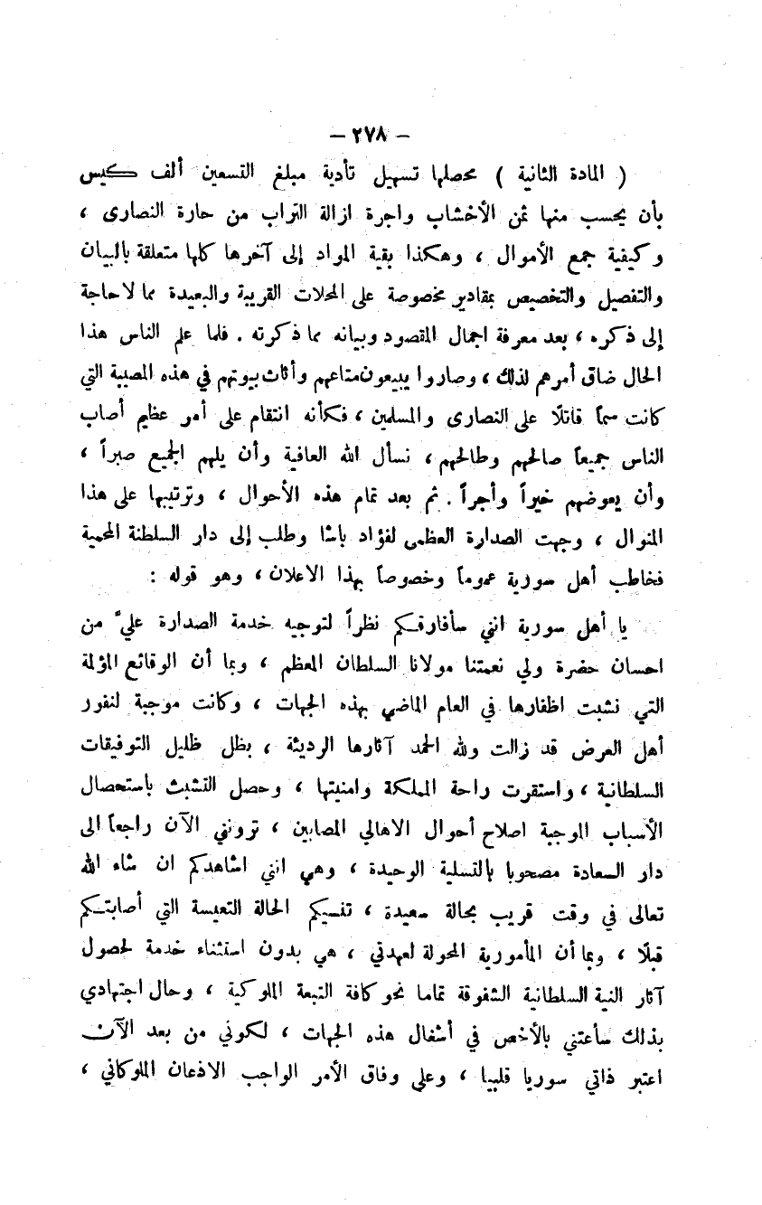 المادة الثانية محصلها تسهيل تأدية مبلغ التسعين ألف كيس بأن يحسب منها ثمن الأخشاب وأجرة إزالة التراب من حارة النصارى، وكيفية جمع الأموال، وهكذا بقية المواد إلى آخرها كلها متعلقة بالبيان والتفصيل والتخصيص بمقادير مخصوصة على المحلات القريبة والبعيدة مما لا حاجة إلى ذكره، بعد معرفة إجمال المقصود وبيانه مما ذكرته. فلما علم الناس هذا الحال ضاق أمرهم لذلك، وصاروا يبيعون متاعهم وأثاث بيوتهم في هذه المصيبة التي كانت سماً قاتلاً على النصارى والمسلمين، فكأنه انتقام على أمر عظيم أصاب الناس جميعاً صالحهم وطالحهم، نسأل الله العافية وأن يلهم الجميع صبراً، وأن يعوضهم خيراً وأجراً. ثم بعد تمام هذه الأحوال، وترتيبها على هذا المنوال، وجهت الصدارة العظمى لفؤاد باشا وطلب إلى دار السلطنة المحمية فخاطب أهل سورية عموماً وخصوصاً بهذا الإعلان، وهو قوله:
