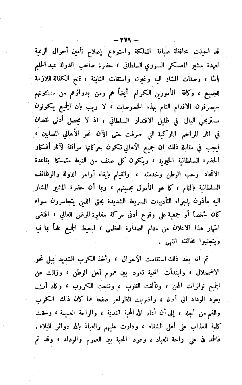 قد أحيلت محافظة صيانة المملكة واستودع إصلاح تأمين أحوال الرعية لعهدة مشير المعسكر السوري السلطاني، حضرة صاحب الدولة عبد الحليم باشا، وصفات المشار إليه وغيرته واستقامته الثابتة، تمنح الكفالة اللازمة للجميع، وكافة المأمورين الكرام أيضاً هم ومن بدوائرهم من كونهم سيصرفون الإقدام التام بهذه الخصوصات، لا ريب بأن الجميع يكونون مستريحي البال في ظليل الاقتدار السلطاني، إذ لا يحصل أدنى نقصان في آثار المراحم الملوكية التي صرفت حتى الآن نحو الأهالي المصابين، فيجب في مقابلة ذلك أن جميع الأهالي تكون حركاتها موافقة لآثار أفكار الحضرة السلطانية الخيرية، ويكون كل صنف من التبعة متمسكاً بقاعدة الاتحاد وحب الوطن وخدمته، والقيام بإيفاء أوامر الدولة والوظائف السلطانية بالتمام، كما هو المأمول بحميتهم، وبما أن حضرة المشير المشار إليه مأذون بإجراء التأديبات السريعة الشديدة بحق الذين يتجاسرون سواء كان شخصاً أو جمعية على وقوع أدنى حركة مغايرة للرضى العالي، اقتضى إشهار هذا الإعلان من مقام الصدارة العظمى، ليحيط الجميع علماً بما فيه ويتجنبوا مخالفته انتهى.