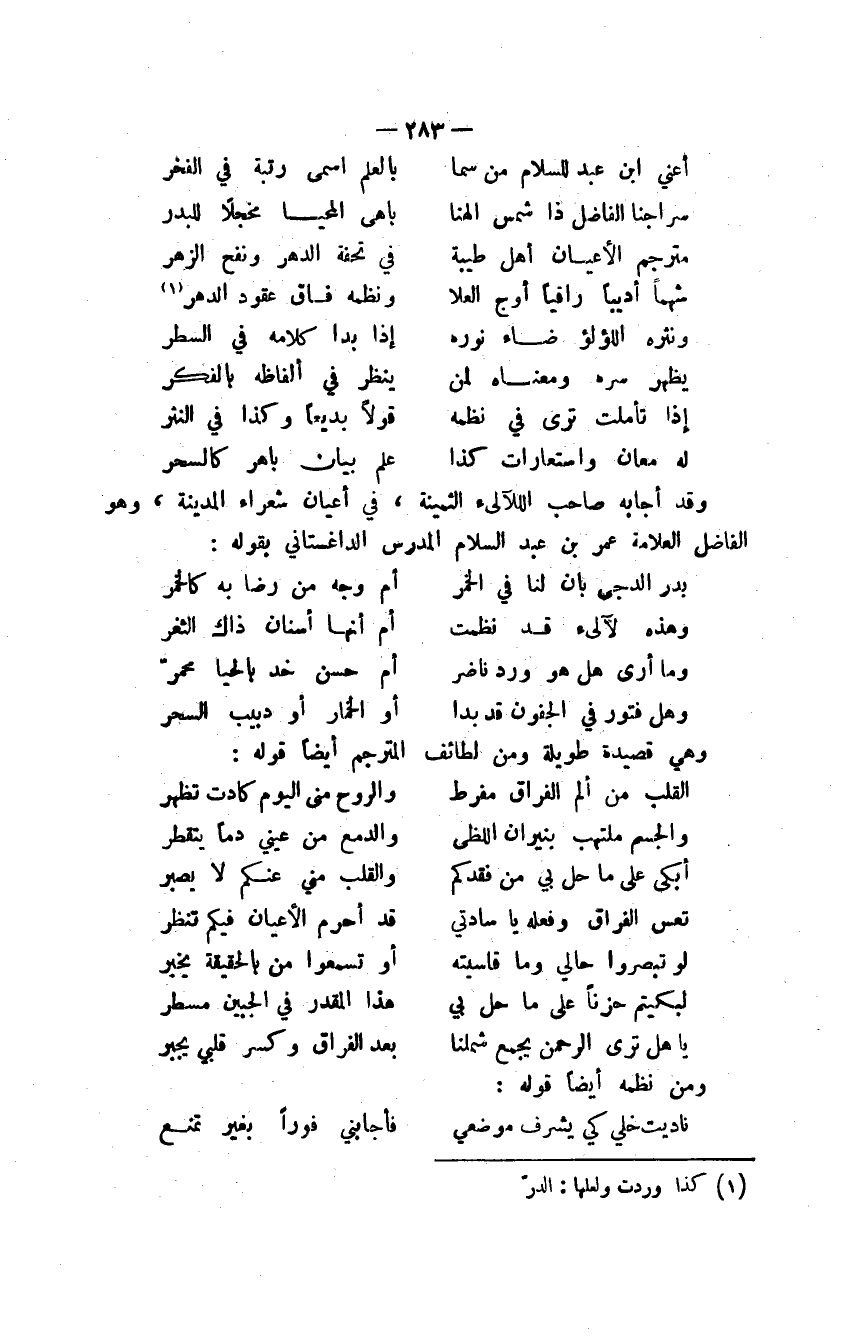 وقد أجابه صاحب اللآلىء الثمينة، في أعيان شعراء المدينة، وهو الفاضل العلامة عمر بن عبد السلام المدرس الداغستاني بقوله: