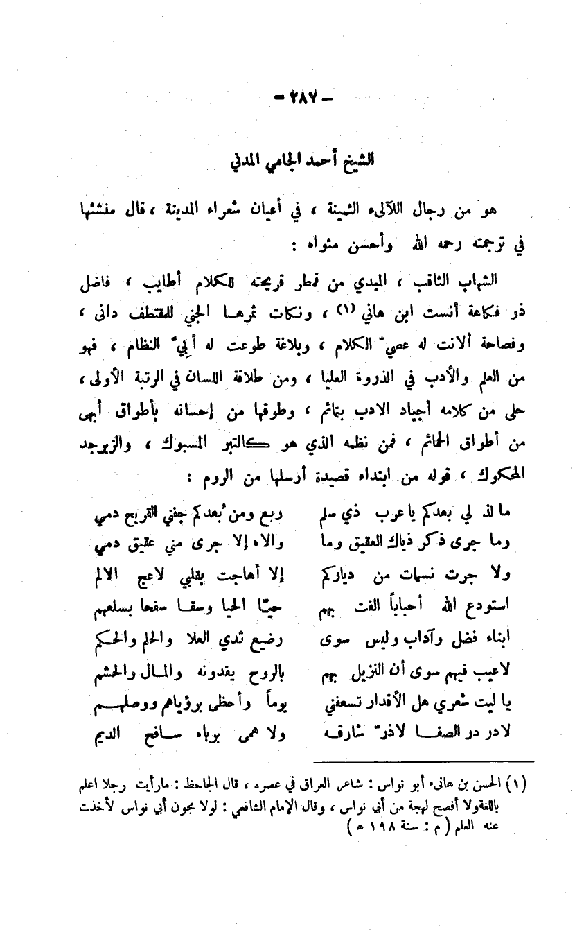 هو من رجال اللآلىء الثمينة، في أعيان شعراء المدينة، قال منشئها في ترجمته رحمه الله وأحسن مثواه: الشهاب الثاقب، المبدي من قمطر قريحته للكلام أطايب، فاضل ذو فكاهة أنست ابن هاني، ونكات ثمرها الجني للمقتطف داني، وفصاحة ألانت له عصي الكلام، وبلاغة طوعت له أبي النظام، فهو من العلم والأدب في الذروة العليا، ومن طلاقة اللسان في الرتبة الأولى، حلى من كلامه أجياد الأدب بتمائم، وطوقها من إحسانه بأطواق أبهى من أطواق الحمائم، فمن نظمه الذي هو كالتبر المسبوك، والزبرجد المحكوك، قوله من ابتداء قصيدة أرسلها من الروم: