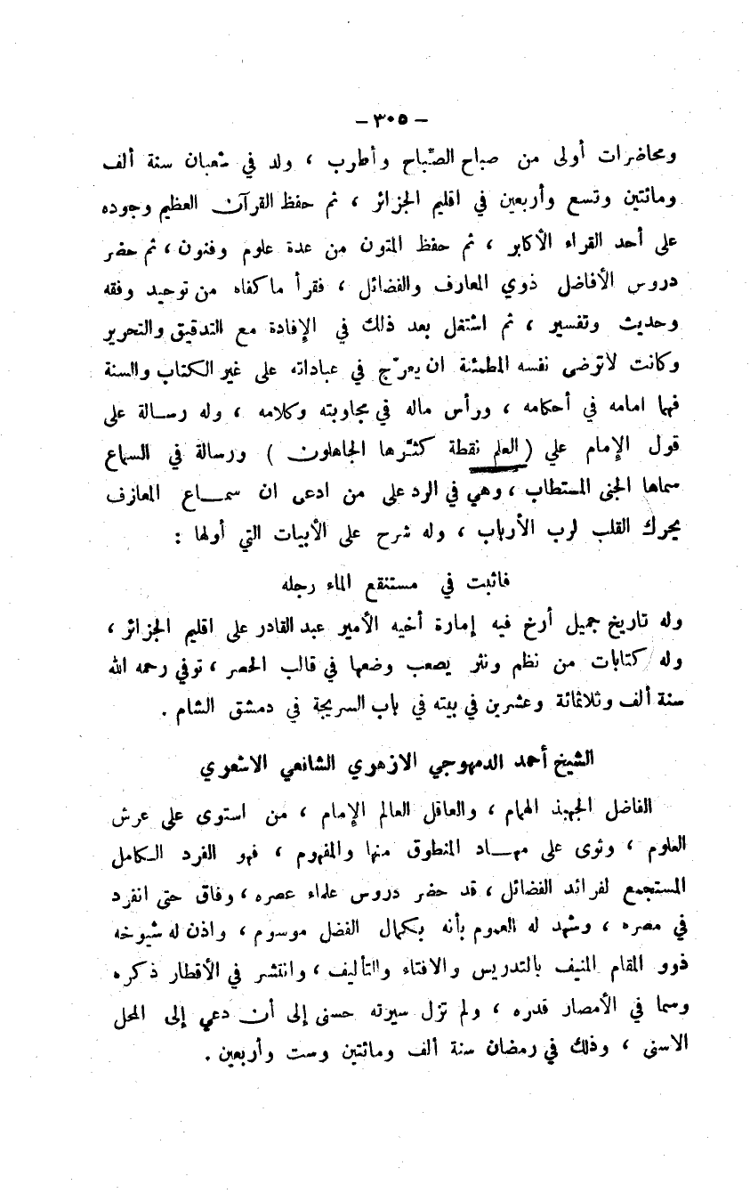 ومحاضرات أولى من صباح الصباح وأطرب، ولد في شعبان سنة ألف ومائتين وتسع وأربعين في إقليم الجزائر، ثم حفظ القرآن العظيم وجوده على أحد القراء الأكابر، ثم حفظ المتون من عدة علوم وفنون، ثم حضر دروس الأفاضل ذوي المعارف والفضائل، فقرأ ما كفاه من توحيد وفقه وحديث وتفسير، ثم اشتغل بعد ذلك في الإفادة مع التدقيق والتحرير وكانت لا ترضى نفسه المطمئنة أن يعرج في عباداته على غير الكتاب والسنة فهما إمامه في أحكامه، ورأس ماله في مجاوبته وكلامه، وله رسالة على قول الإمام علي العلم نقطة كثرها الجاهلون ورسالة في السماع سماها الجنى المستطاب، وهي في الرد على من ادعى أن سماع المعازف يحرك القلب لرب الأرباب، وله شرح على الأبيات التي أولها: