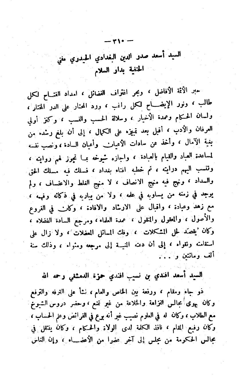 حبر الأئمة الأفاضل، وبحر اغتراف الفضائل، إمداد الفتاح لكل طالب، ونور الإيضاح لكل راغب، ورد المحتار على الدر المختار، ولسان الحكام وعمدة الأخيار، وسلالة الحسب والنسب، وكنز أولي العرفان والأدب، أقبل بعد تمييزه على الكمال، إلى أن بلغ رشده من بغية الآمال، وأخذ عن سادات الأعيان وأعيان السادة، ونصب نفسه لمساعدة العباد والقيام بالعبادة، وأجازه شيوخه بما تجوز لهم روايته، وتنسب إليهم درايته، ثم خطبه إفتاء بغداد، فسلك فيه مسلك الحق والسداد، ونهج فيه منهج الإنصاف، لا منهج الغلط والاعتساف، ولم يوجد في زمنه من يساويه في علمه، ولا من يباريه في ذكائه وفهمه، مع زهد وعبادة، وإقبال على الإرشاد والإفادة، وكان في الفروع والأصول، والمعقول والمنقول، عمدة العلماء، ومرجع السادة الفضلاء، وكان يقصد لحل المشكلات، وفك المسائل المعضلات، ولا زال على استقامته وتقواه، إلى أن دعته المنية إلى مرجعه ومثواه، وذلك سنة ألف ومائتين و ...