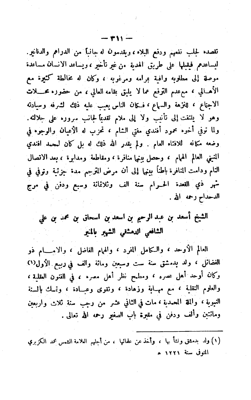 تقصده لجلب نفعهم ودفع البلاء، ويقدمون له جانباً من الدراهم والدنانير. ليساعدهم فيقبلها على طريق الهدية من غير تأخير، ويساعد الإنسان مساعدة موصلة إلى مطلوبه وافية بمرامه ومرغوبه، وكان له مخالطة كثيرة مع الأهالي، مع عدم الترفع عما لا يليق بمقامه العالي، من حضوره محلات الاجتماع، للنزهة والسماع، فكان الناس يعيب عليه ذلك لشرفه وسيادته وهو لا يلتفت إلى تأنيب ولا إلى ملام تقديماً لجانب سروره على جلالته. ولما توفي أخوه محمود أفندي مفتي الشام، تحزب له الأعيان والوجوه في وضعه مكانه للإفتاء العام. ولم يقدر الله ذلك له بل كان لمحمد أفندي المنيني العالم الهمام، وحصل بينهما منافرة، ومقاطعة ومدابرة، بعد الاتصال التام ودامت المنافرة باطناً بينهما إلى أن مرض المترجم مدة جزئية وتوفي في شهر ذي القعدة الحرام سنة ألف وثلاثمائة وسبع ودفن في مرج الدحداح رحمه الله.