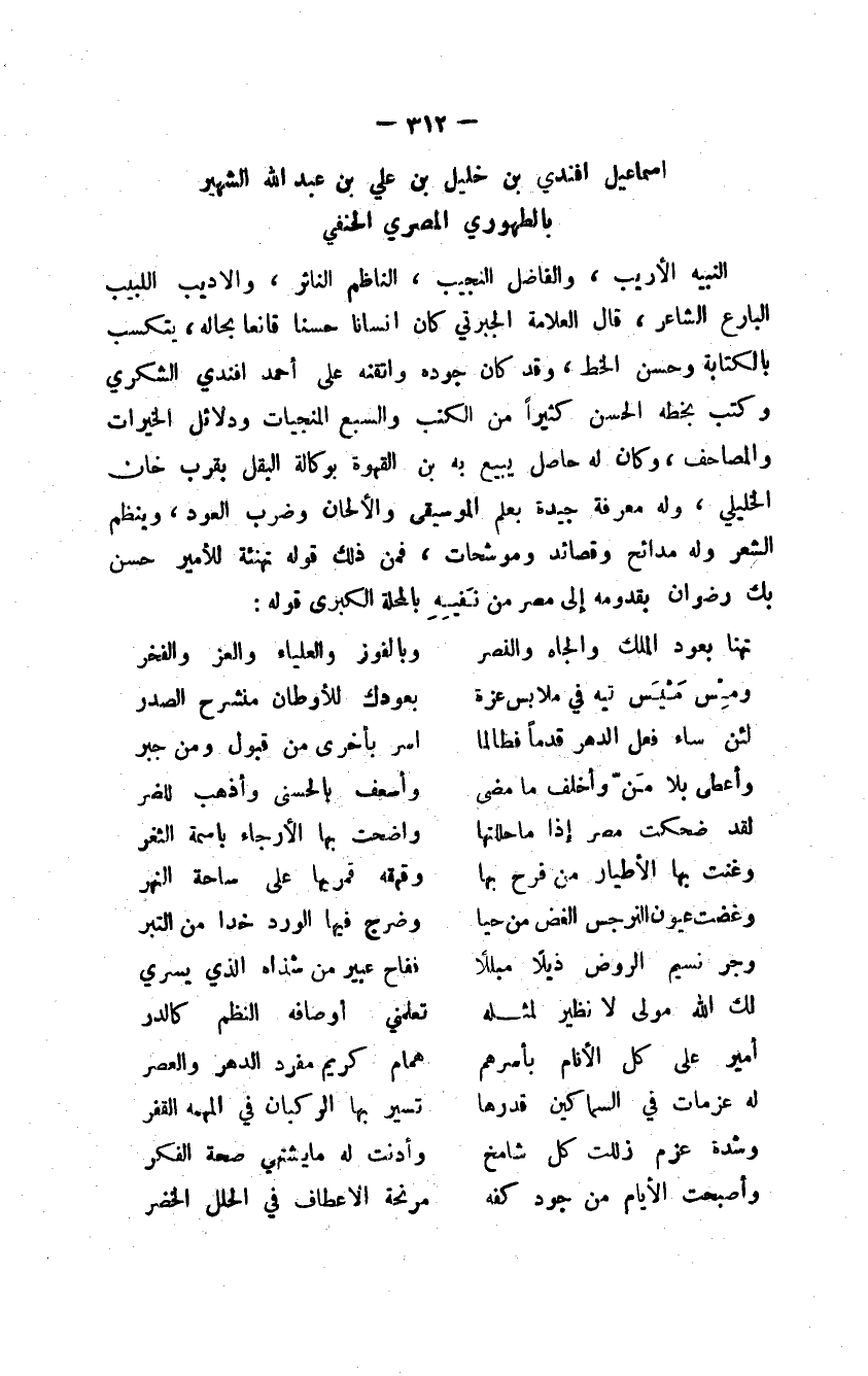 النبيه الأريب، والفاضل النجيب، الناظم الناثر، والأديب اللبيب البارع الشاعر، قال العلامة الجبرتي كان إنساناً حسناً قانعاً بحاله، يتكسب بالكتابة وحسن الخط، وقد كان جوده وأتقنه علي أحمد أفندي الشكري وكتب بخطه الحسن كثيراً من الكتب والسبع المنجيات ودلائل الخيرات والمصاحف، وكان له حاصل يبيع به بن القهوة بوكالة البقل بقرب خان الخليلي، وله معرفة جيدة بعلم الموسيقى والألحان وضرب العود، وينظم الشعر وله مدائح وقصائد وموشحات، فمن ذلك قوله تهنئة للأمير حسن بك رضوان بقدومه إلى مصر من نفيه بالمحلة الكبرى قوله: