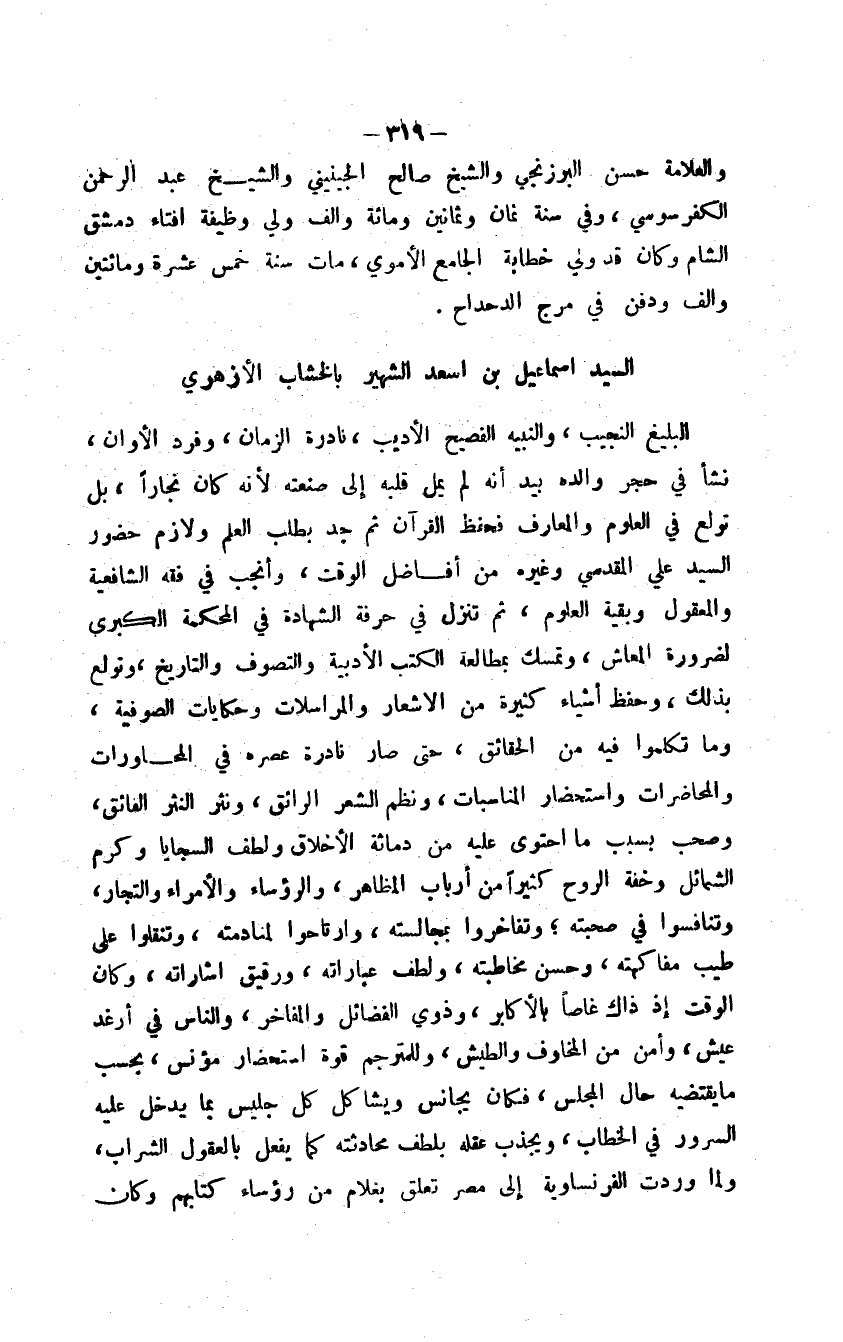 البليغ النجيب، والنبيه الفصيح الأديب، نادرة الزمان، وفرد الأوان، نشأ في حجر والده بيد أنه لم يمل قلبه إلى صنعته لأنه كان نجاراً، بل تولع في العلوم والمعارف فحفظ القرآن ثم جد بطلب العلم ولازم حضور السيد علي المقدسي وغيره من أفاضل الوقت، وأنجب في فقه الشافعية والمعقول وبقية العلوم، ثم تنزل في حرفة الشهادة في المحكمة الكبرى لضرورة المعاش، وتمسك بمطالعة الكتب الأدبية والتصوف والتاريخ، وتولع بذلك، وحفظ أشياء كثيرة من الأشعار والمراسلات وحكايات الصوفية، وما تكلموا فيه من الحقائق، حتى صار نادرة عصره في المحاورات والمحاضرات واستحضار المناسبات، ونظم الشعر الرائق، ونثر النثر الفائق، وصحب بسبب ما احتوى عليه من دماثة الأخلاق ولطف السجايا وكرم الشمائل وخفة الروح كثيراً من أرباب المظاهر، والرؤساء والأمراء والتجار، وتنافسوا في صحبته؛ وتفاخروا بمجالسته، وارتاحوا لمنادمته، وتنقلوا على طيب مفاكهته، وحسن مخاطبته، ولطف عباراته، ورقيق إشاراته، وكان الوقت إذ ذاك غاصاً بالأكابر، وذوي الفضائل والمفاخر، والناس في أرغد عيش، وأمن من المخاوف والطيش، وللمترجم قوة استحضار مؤنس، بحسب ما يقتضيه حال المجلس، فكان يجانس ويشاكل كل جليس بما يدخل عليه السرور في الخطاب، ويجذب عقله بلطف محادثته كما يفعل بالعقول الشراب، ولما وردت الفرنساوية إلى مصر تعلق بغلام من رؤساء كتابهم وكان