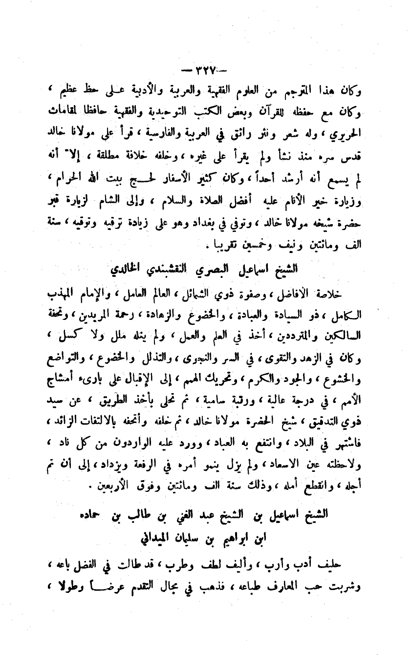 خلاصة الأفاضل، وصفوة ذوي الشمائل، العالم العامل، والإمام المهذب الكامل، ذو السيادة والعبادة، والخضوع والزهادة، رحمة المريدين، وتحفة السالكين والمترددين، أخذ في العلم والعمل، ولم ينله ملل ولا كسل، وكان في الزهد والتقوى، في السر والنجوى، والتذلل والخضوع، والتواضع والخشوع، والجود والكرم، وتحريك الهمم، إلى الإقبال على بارىء أمشاج الأمم، في درجة عالية، ورتبة سامية، ثم تحلى بأخذ الطريق، عن سيد ذوي التدقيق، شيخ الحضرة مولانا خالد، ثم خلفه وأتحفه بالالتفات الزائد، فاشتهر في البلاد، وانتفع به العباد، وورد عليه الواردون من كل ناد، ولاحظته عين الإسعاد، ولم يزل ينمو أمره في الرفعة ويزداد، إلى أن تم أجله، وانقطع أمله، وذلك سنة الف ومائتين وفوق الأربعين.
