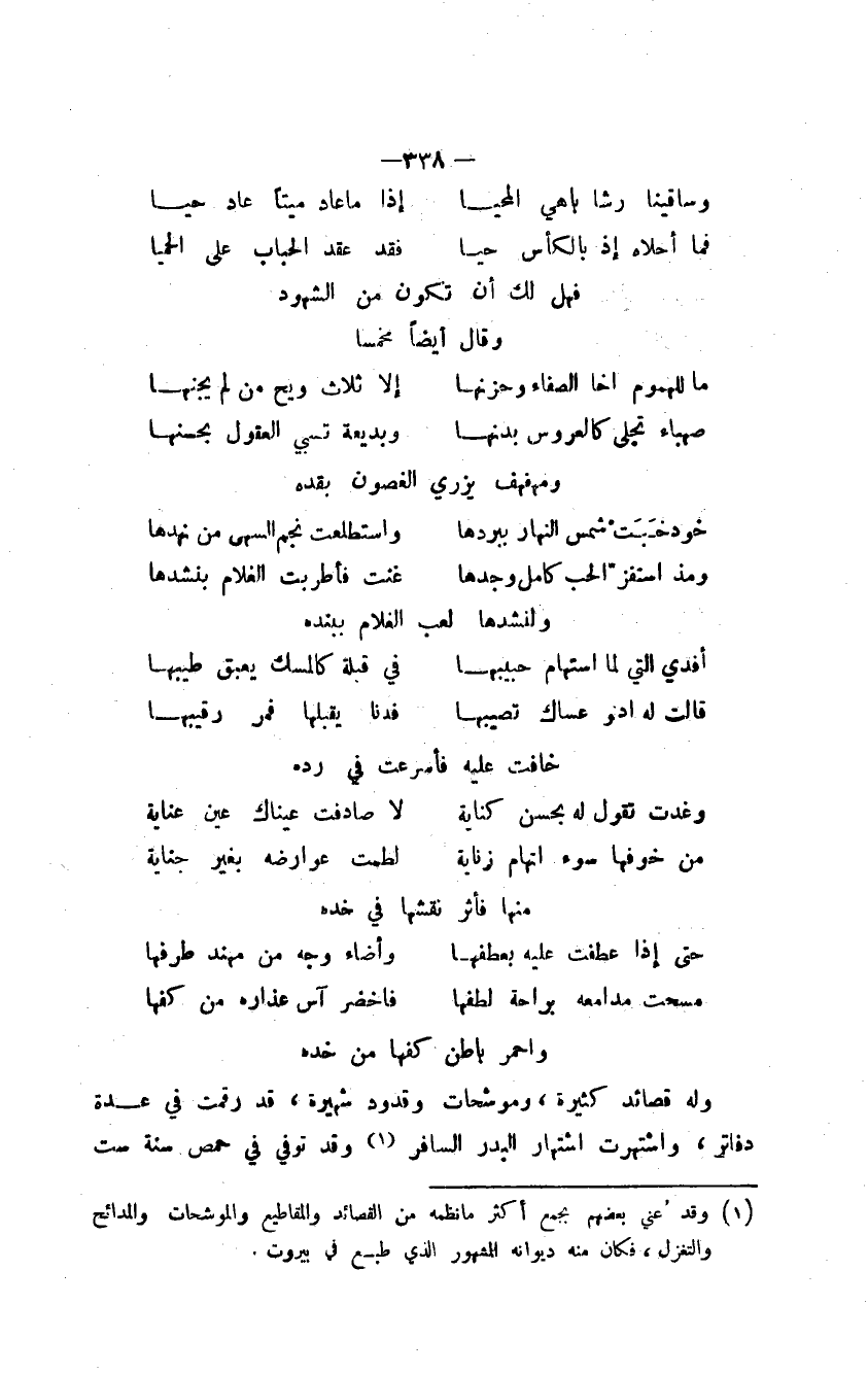 وله قصائد كثيرة، وموشحات وقدود شهيرة، قد رقمت في عدة دفاتر، واشتهرت اشتهار البدر السافر وقد توفي في حمص سنة ست