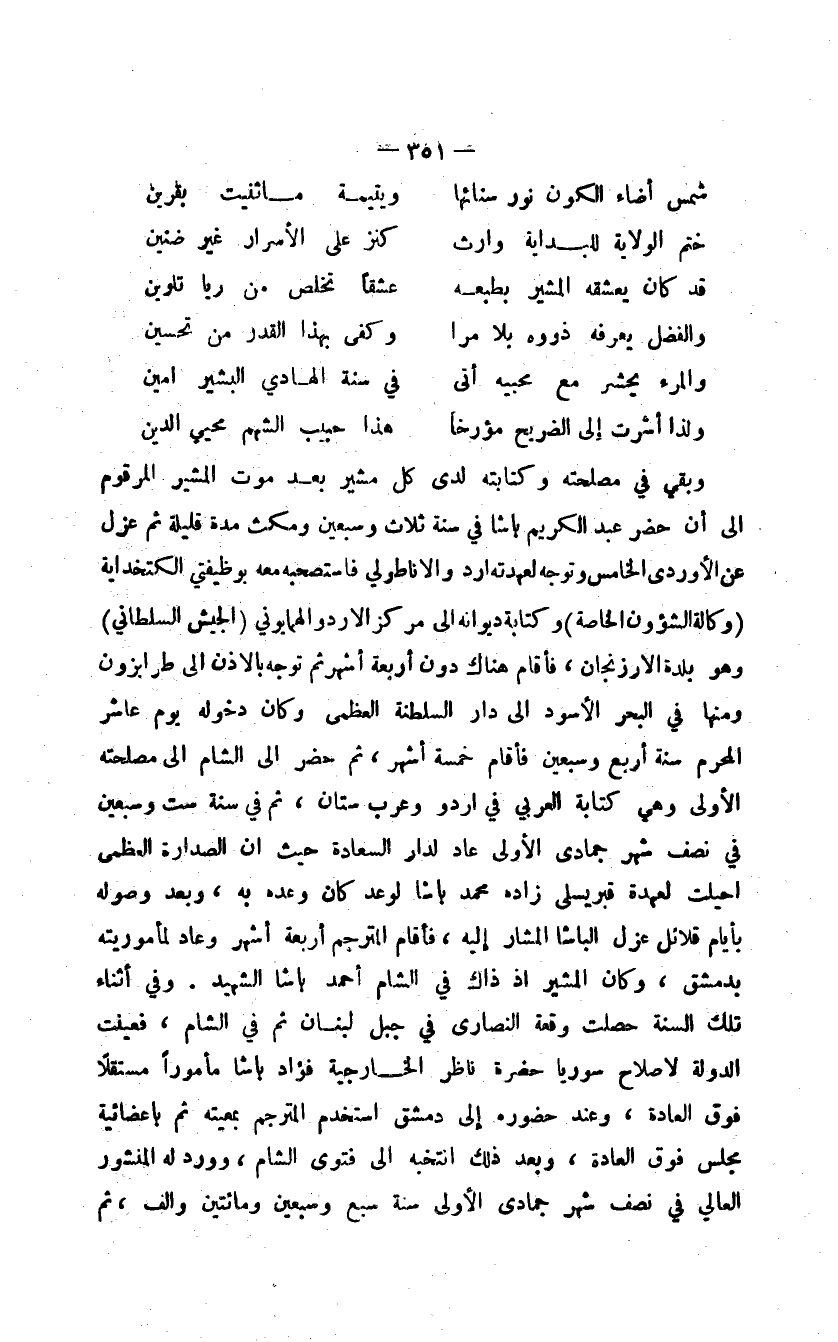 وبقي في مصلحته وكتابته لدى كل مشير بعد موت المشير المرقوم إلى أن حضر عبد الكريم باشا في سنة ثلاث وسبعين ومكث مدة قليلة ثم عزل عن الأوردي الخامس وتوجه لعهدته ارد والأناطولي فاستصحبه معه بوظيفتي الكتخداية وكالة الشؤون الخاصة وكتابة ديوانه إلى مركز الارد والهمايوني الجيش السلطاني وهو بلدة الأرزنجان، فأقام هناك دون أربعة أشهر ثم توجه بالإذن إلى طرابزون ومنها في البحر الأسود إلى دار السلطنة العظمى وكان دخوله يوم عاشر المحرم سنة أربع وسبعين فأقام خمسة أشهر، ثم حضر إلى الشام إلى مصلحته الأولى وهي كتابة العربي في أردو وعرب ستان، ثم في سنة ست وسبعين في نصف شهر جمادى الأولى عاد لدار السعادة حيث أن الصدارة العظمى أحيلت لعهدة قبريسلي زاده محمد باشا لوعد كان وعده به، وبعد وصوله بأيام قلائل عزل الباشا المشار إليه، فأقام المترجم أربعة أشهر وعاد لمأموريته بدمشق، وكان المشير إذ ذاك في الشام أحمد باشا الشهيد. وفي أثناء تلك السنة حصلت وقعة النصارى في جبل لبنان ثم في الشام، فعينت الدولة لإصلاح سوريا حضرة ناظر الخارجية فؤاد باشا مأموراً مستقلاً فوق العادة، وعند حضوره إلى دمشق استخدم المترجم بمعيته ثم بإعضائية مجلس فوق العادة، وبعد ذلك انتخبه إلى فتوى الشام، وورد له المنشور العالي في نصف شهر جمادى الأولى سنة سبع وسبعين ومائتين وألف، ثم