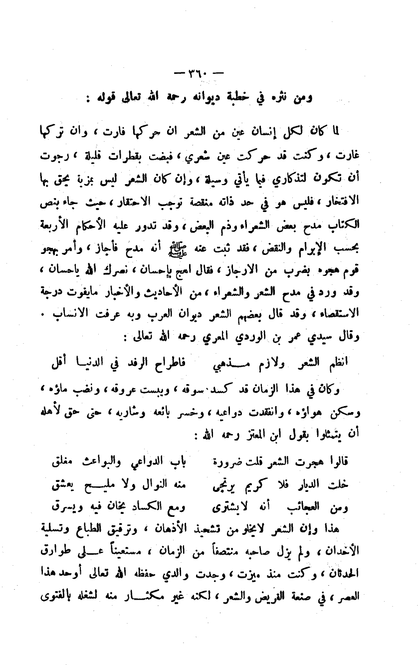 ومن نثره في خطبة ديوانه رحمه الله تعالى قوله: لما كان لكل إنسان عين من الشعر إن حركها فارت، وإن تركها غارت، وكنت قد حركت عين شعري، فبضت بقطرات قليلة، رجوت أن تكون لتذكاري فيما يأتي وسيلة، وإن كان الشعر ليس بمزية يحق بها الافتخار، فليس هو في حد ذاته منقصة توجب الاحتقار، حيث جاء بنص الكتاب مدح بعض الشعراء وذم البعض، وقد تدور عليه الأحكام الأربعة بحسب الإبرام والنقض، فقد ثبت عنه صلى الله عليه وسلم أنه مدح فأجاز، وأمر بهجو قوم هجوه بضرب من الأرجاز، فقال اهج بإحسان، نصرك الله يا حسان، وقد ورد في مدح الشعر والشعراء، من الأحاديث والأخبار ما يفوت درجة الاستقصاء، وقد قال بعضهم الشعر ديوان العرب وبه عرفت الأنساب. وقال سيدي عمر بن الوردي المعري رحمه الله تعالى: