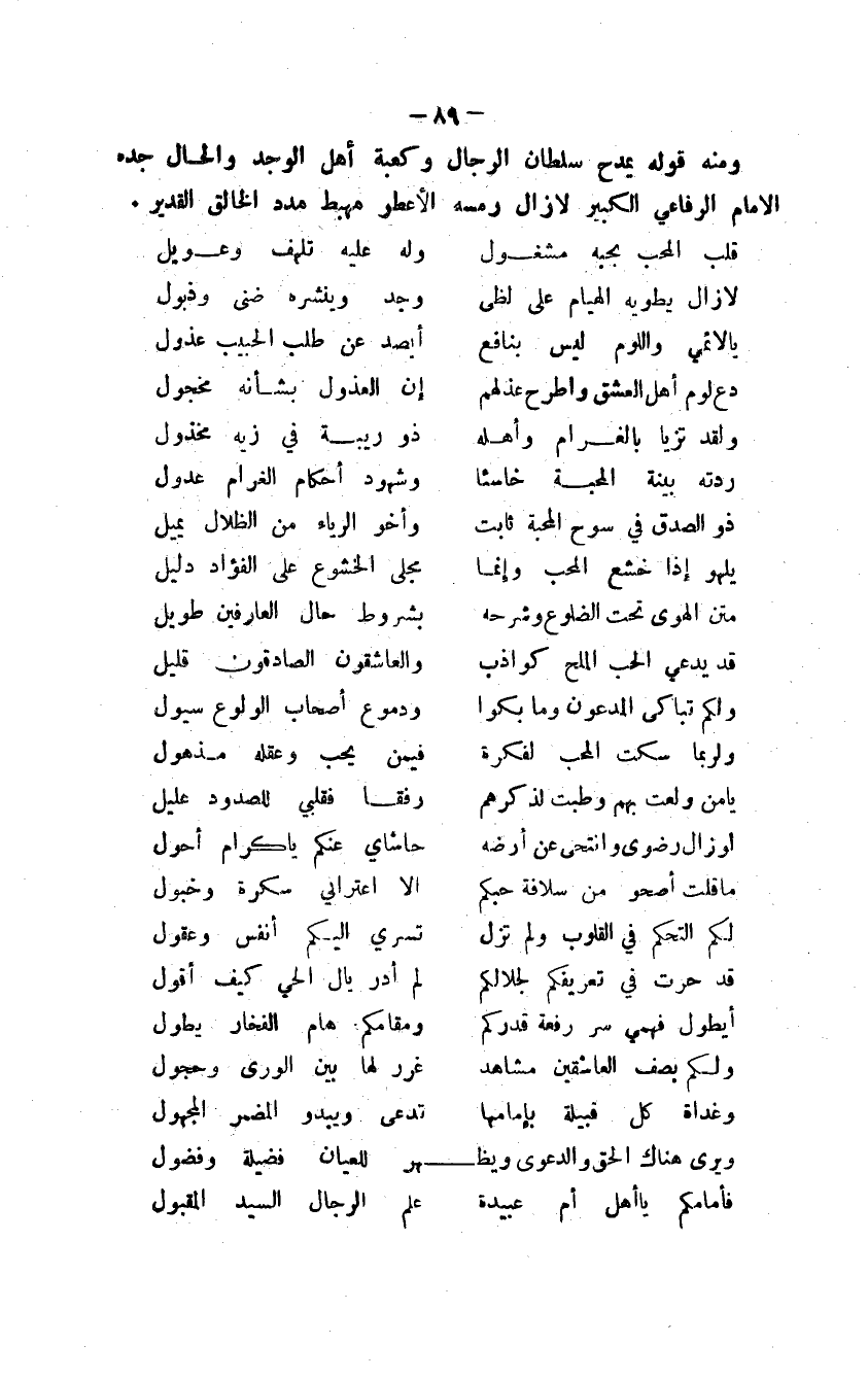 ومنه قوله يمدح سلطان الرجال وكعبة أهل الوجد والحال جده الإمام الرفاعي الكبير لا زال رمسه الأعطر مهبط مدد الخالق القدير.