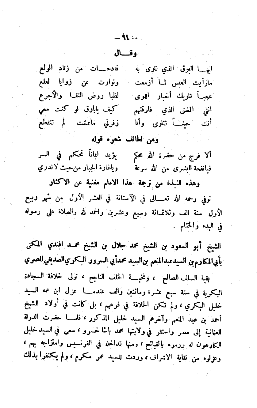 بقية السلف الصالح، ونخبة الخلف الناجح، تولى خلافة السجادة البكرية في سنة سبع عشرة ومائتين وألف عندما عزل ابن عمه السيد خليل البكري، ولم تكن الخلافة في فرعهم، بل كانت في أولاد الشيخ أحمد بن عبد المنعم وآخرهم السيد خليل المذكور، فلما حضرت الدولة العثمانية إلى مصر واستقر في ولايتها محمد باشا خسرو، سعى في السيد خليل الكارهون له ورموه بالقبائح، ومنها تداخله في الفرنسيس وامتزاجه بهم، وعزلوه من نقابة الأشراف، وردت للسيد عمر مكرم، ولم يكتفوا بذلك
