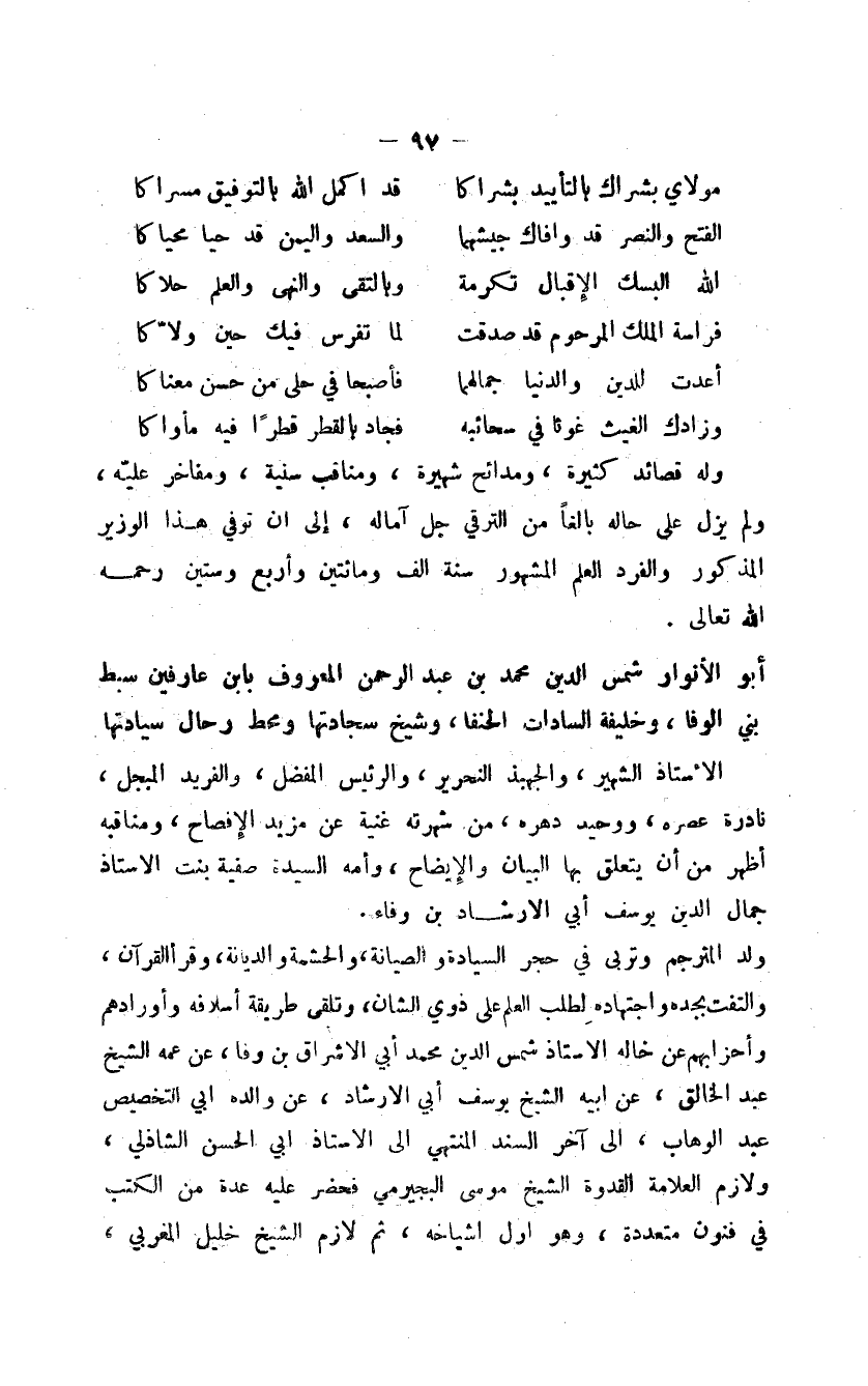 أبو الأنوار شمس الدين محمد بن عبد الرحمن المعروف بابن عارفين سبط بني الوفا، وخليفة السادات الحنفا، وشيخ سجادتها ومحط رحال سيادتها