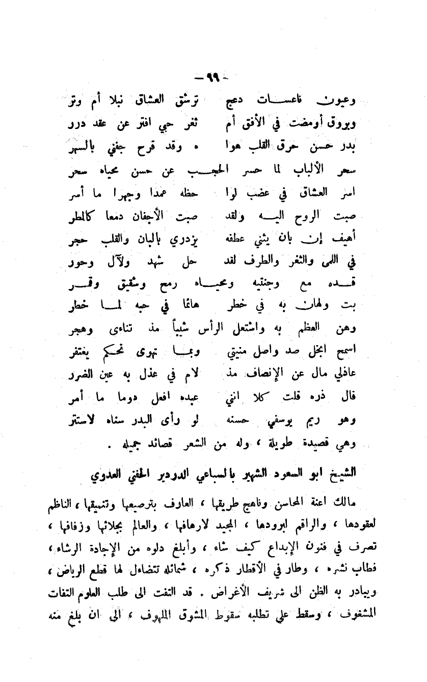 مالك أعنة المحاسن وناهج طريقها، العارف بترصيعها وتنميقها، الناظم لعقودها، والراقم لبرودها، المجيد لإرهافها، والعالم بجلائها وزفافها، تصرف في فنون الإبداع كيف شاء، وأبلغ دلوه من الإجادة الرشاء، فطاب نشره، وطار في الأقطار ذكره، شمائله تتضاءل لها قطع الرياض، ويبادر به الظن إلى شريف الأغراض. قد التفت إلى طلب العلوم التفات المشغوف، وسقط على تطلبه سقوط المشوق الملهوف، إلى أن بلغ منه