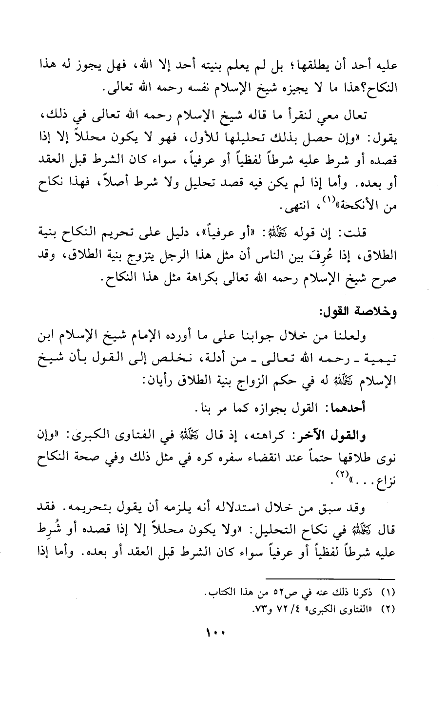 تعال معي لنقرأ ما قاله شيخ الإسلام رحمه الله تعالى في ذلك، يقول: «وإن حصل بذلك تحليلها للأول، فهو لا يكون محللاً إلا إذا قصده أو شرط عليه شرطًا لفظيًا أو عرفيًا، سواء كان الشرط قبل العقد أو بعده. وأما إذا لم يكن فيه قصد تحليل ولا شرط أصلاً، فهذا نكاح من الأنكحة» (¬1)، انتهى.