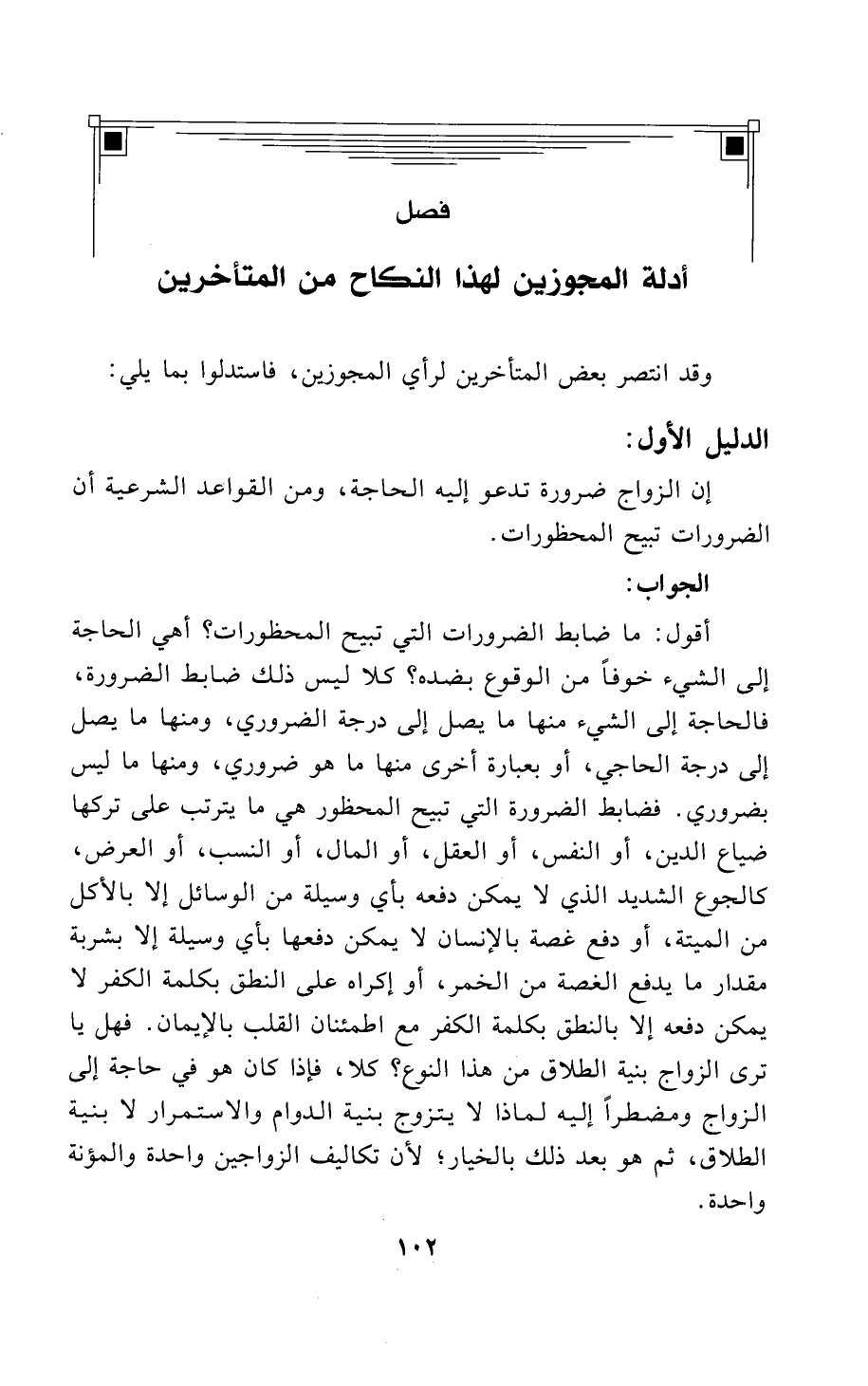 أقول: ما ضابط الضرورات التي تبيح المحظورات؟ أهي الحاجة إلى الشيء خوفًا من الوقوع بضده؟ كلا ليس ذلك ضابط الضرورة، فالحاجة إلى الشيء منها ما يصل إلى درجة الضروري، ومنها ما يصل إلى درجة الحاجي، أو بعبارة أخرى منها ما هو ضروري، ومنها ما ليس بضروري. فضابط الضرورة التي تبيح المحظور هي ما يترتب على تركها ضياع الدين، أو النفس، أو العقل، أو المال، أو النسب، أو العرض، كالجوع الشديد الذي لا يمكن دفعه بأي وسيلة من الوسائل إلا بالأكل من الميتة، أو دفع غصة بالإنسان لا يمكن دفعها بأي وسيلة إلا بشربة مقدار ما يدفع الغصة من الخمر، أو إكراه على النطق بكلمة الكفر لا يمكن دفعه إلا بالنطق بكلمة الكفر مع اطمئنان القلب بالإيمان. فهل يا ترى الزواج بنية الطلاق من هذا النوع؟ كلا، فإذا كان هو في حاجة إلى الزواج ومضطرًا إليه لماذا لا يتزوج بنية الدوام والاستمرار لا بنية الطلاق، ثم هو بعد ذلك بالخيار؛ لأن تكاليف الزواجين واحدة والمؤنة واحدة.