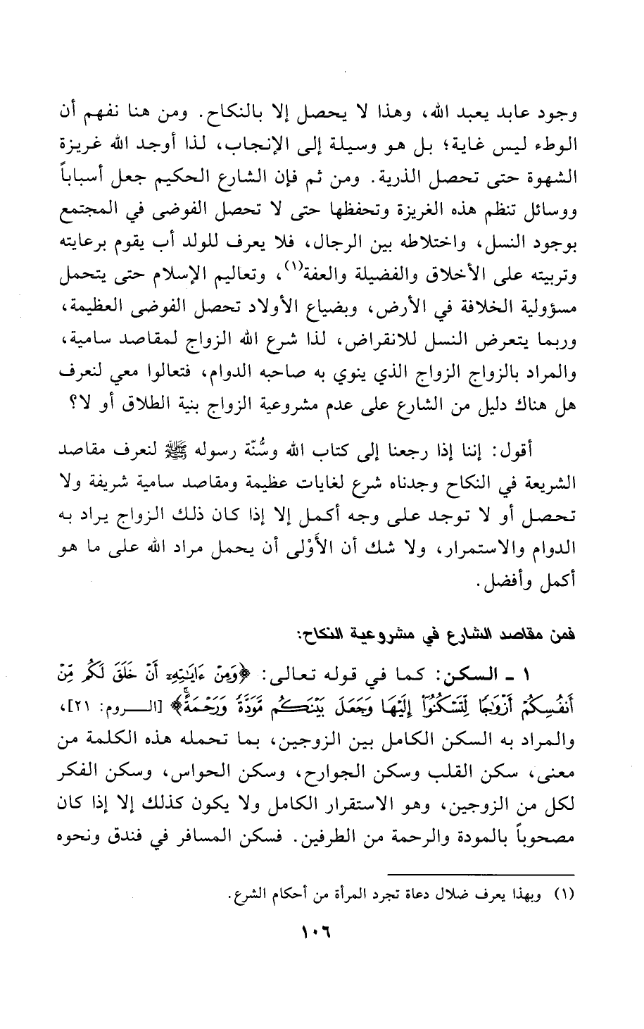 1 - السكن: كما في قوله تعالى: {وَمِنْ آَيَاتِهِ أَنْ خَلَقَ لَكُمْ مِنْ أَنْفُسِكُمْ أَزْوَاجًا لِتَسْكُنُوا إِلَيْهَا وَجَعَلَ بَيْنَكُمْ مَوَدَّةً وَرَحْمَةً} [الروم: 21]، والمراد به السكن الكامل بين الزوجين، بما تحمله هذه الكلمة من معنى، سكن القلب وسكن الجوارح، وسكن الحواس، وسكن الفكر لكل من الزوجين، وهو الاستقرار الكامل ولا يكون كذلك إلا إذا كان مصحوبًا بالمودة والرحمة من الطرفين. فسكن المسافر في فندق ونحوه