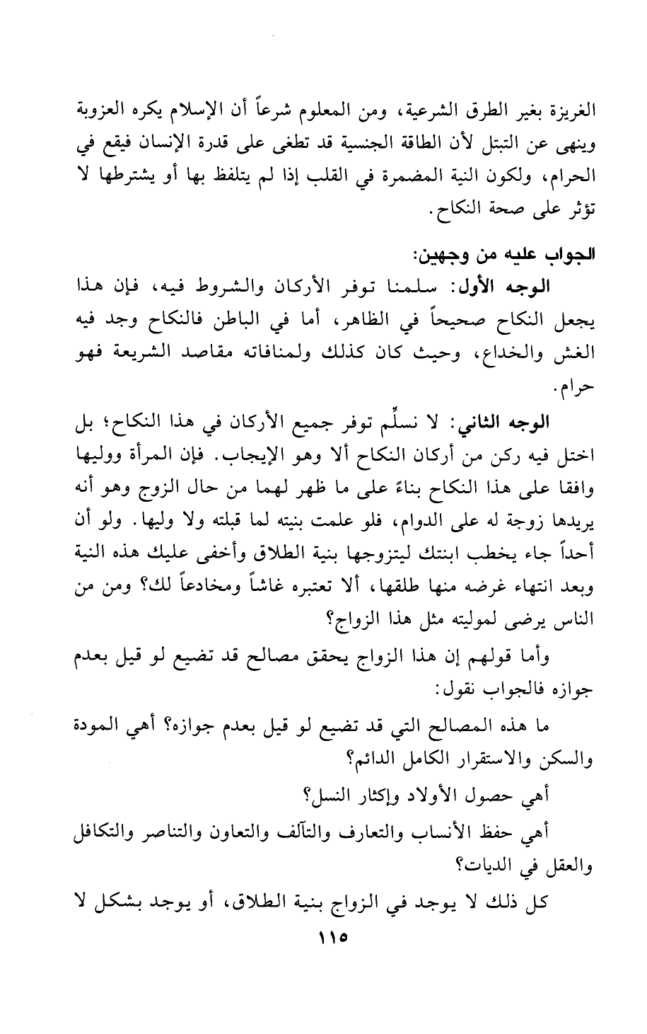 الغريزة بغير الطرق الشرعية، ومن المعلوم شرعًا أن الإسلام يكره العزوبة وينهى عن التبتل لأن الطاقة الجنسية قد تطغى على قدرة الإنسان فيقع في الحرام، ولكون النية المضمرة في القلب إذا لم يتلفظ بها أو يشترطها لا تؤثر على صحة النكاح.