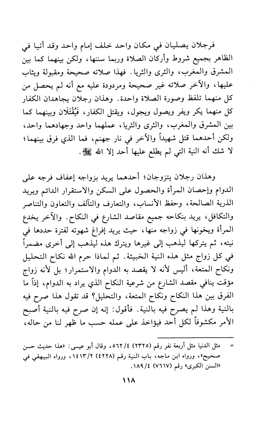 وهذان رجلان يتزوجان؛ أحدهما يريد بزواجه إعفاف فرجه على الدوام وإحصان المرأة والحصول على السكن والاستقرار الدائم ويريد الذرية الصالحة، وحفظ الأنساب، والتعارف والتآلف والتعاون والتناصر والتكافل، يريد بنكاحه جميع مقاصد الشارع في النكاح. والآخر يخدع المرأة ويخونها في زواجه منها، حيث يريد إفراغ شهوته لفترة حددها في نيته، ثم يتركها ليذهب إلى غيرها ويترك هذه ليذهب إلى أخرى مضمرًا في كل زواج مثل هذه النية الخبيثة. ثم لماذا حرم الله نكاح التحليل ونكاح المتعة، أليس لأنه لا يقصد به الدوام والاستمرار؛ بل لأنه زواج مؤقت ينافي مقصد الشارع من شرعية النكاح الذي يراد به الدوام، إذًا ما الفرق بين هذا النكاح ونكاح المتعة، والتحليل؟ قد تقول هذا صرح فيه بالنية وهذا لم يصرح فيه بالنية. فأقول: إنه إن صرح فيه بالنية أصبح الأمر مكشوفًا لكل أحد فيؤاخذ على عمله حسب ما ظهر لنا من حاله،