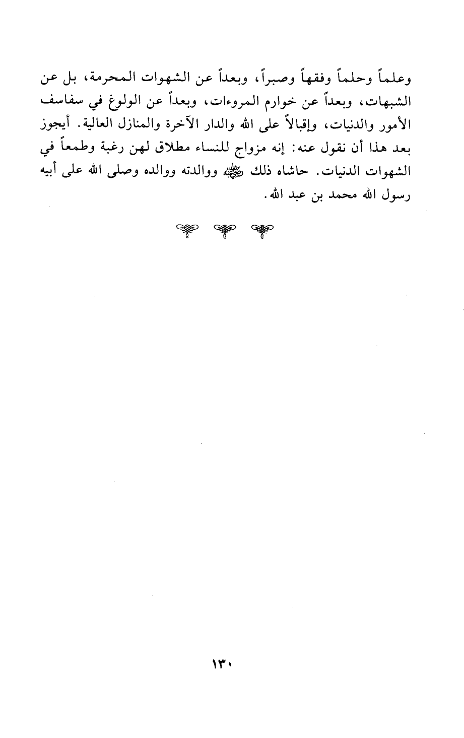 وعلمًا وحلمًا وفقهًا وصبرًا، وبعدًا عن الشهوات المحرمة، بل عن الشبهات، وبعدًا عن خوارم المروءات، وبعدًا عن الولوغ في سفاسف الأمور والدنيات، وإقبالاً على الله والدار الآخرة والمنازل العالية. أيجوز بعد هذا أن نقول عنه: إنه مزواج للنساء مطلاق لهن رغبة وطمعًا في الشهوات الدنيات. حاشاه ذلك رضي الله عنه ووالدته ووالده وصلى الله على أبيه رسول الله محمد بن عبد الله.