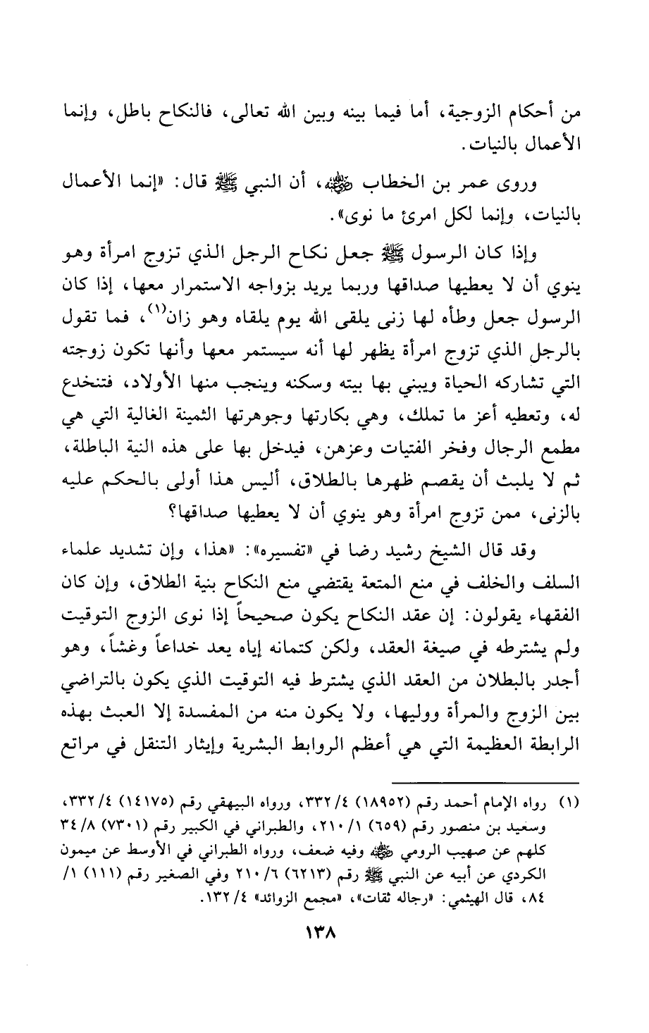 وقد قال الشيخ رشيد رضا في «تفسيره»: «هذا، وإن تشديد علماء السلف والخلف في منع المتعة يقتضي منع النكاح بنية الطلاق، وإن كان الفقهاء يقولون: إن عقد النكاح يكون صحيحًا إذا نوى الزوج التوقيت ولم يشترطه في صيغة العقد، ولكن كتمانه إياه يعد خداعًا وغشًا، وهو أجدر بالبطلان من العقد الذي يشترط فيه التوقيت الذي يكون بالتراضي بين الزوج والمرأة ووليها، ولا يكون منه من المفسدة إلا العبث بهذه الرابطة العظيمة التي هي أعظم الروابط البشرية وإيثار التنقل في مراتع