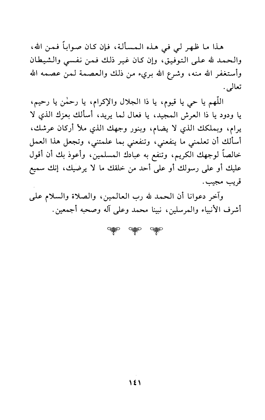 هذا ما ظهر لي في هذه المسألة، فإن كان صوابًا فمن الله، والحمد لله على التوفيق، وإن كان غير ذلك فمن نفسي والشيطان وأستغفر الله منه، وشرع الله بريء من ذلك والعصمة لمن عصمه الله تعالى.