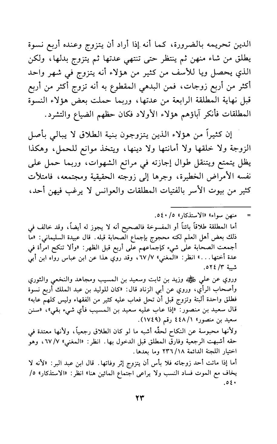 الدين تحريمه بالضرورة، كما أنه إذا أراد أن يتزوج وعنده أربع نسوة يطلق من شاء منهن ثم ينتظر حتى تنتهي عدتها ثم يتزوج بدلها، ولكن الذي يحصل ويا للأسف من كثير من هؤلاء أنه يتزوج في شهر واحد أكثر من أربع زوجات، فمن البدهي المقطوع به أنه تزوج أكثر من أربع قبل نهاية المطلقة الرابعة من عدتها، وربما حملت بعض هؤلاء النسوة المطلقات فأنكر آباؤهم هؤلاء الأولاد فكان حظهم الضياع والتشرد.