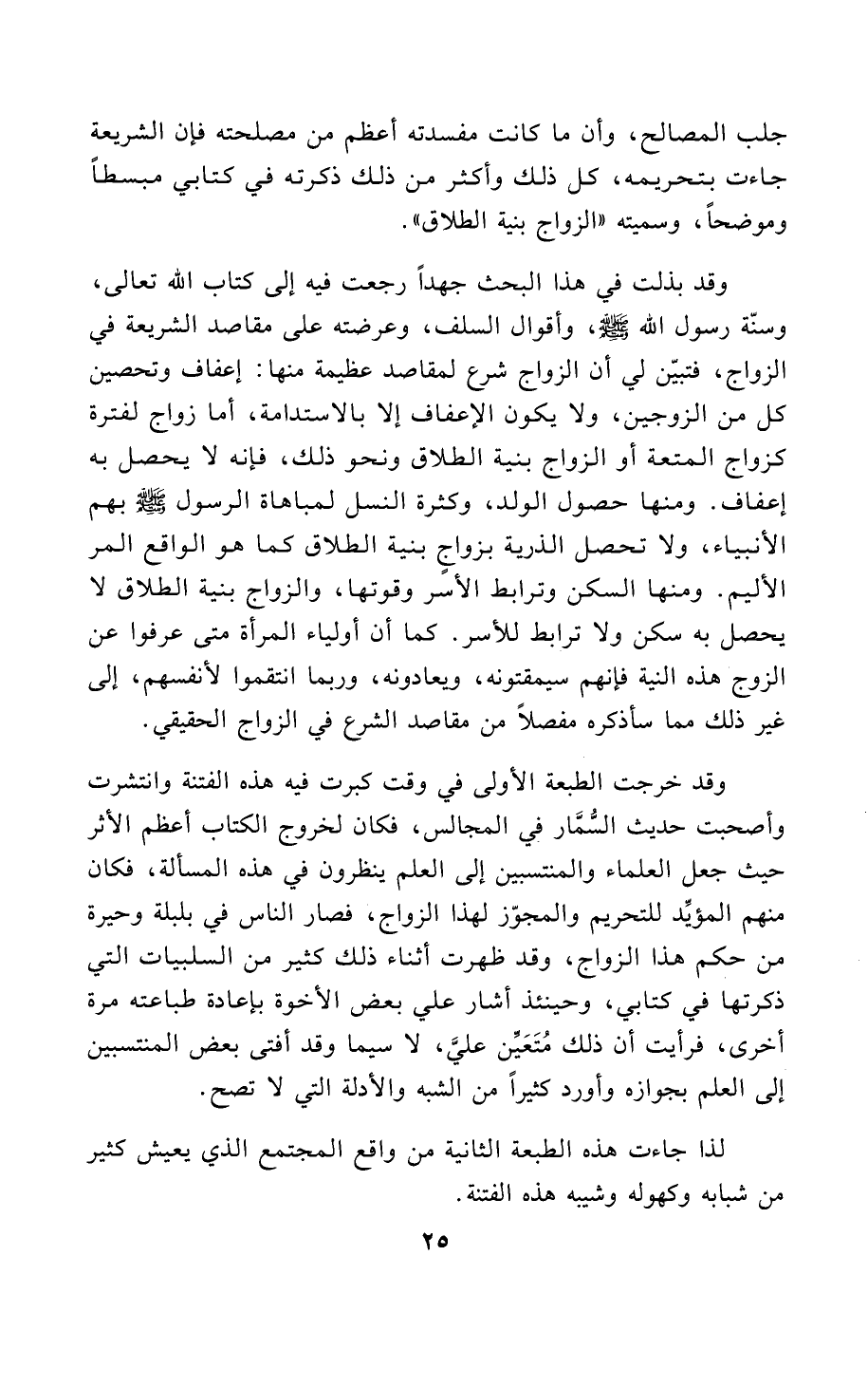 جلب المصالح، وأن ما كانت مفسدته أعظم من مصلحته فإن الشريعة جاءت بتحريمه، كل ذلك وأكثر من ذلك ذكرته في كتابي مبسطًا وموضحًا، وسميته (الزواج بنية الطلاق).